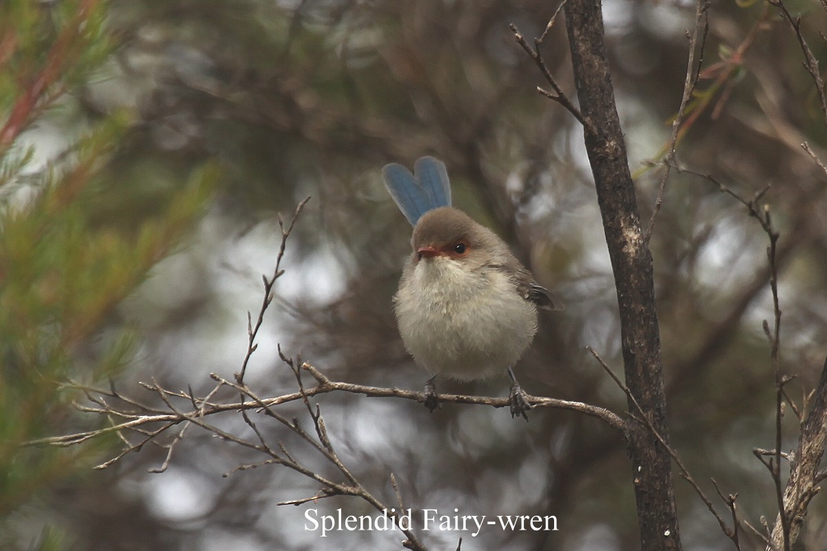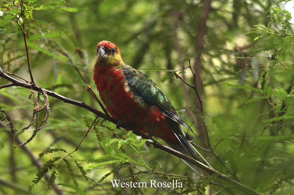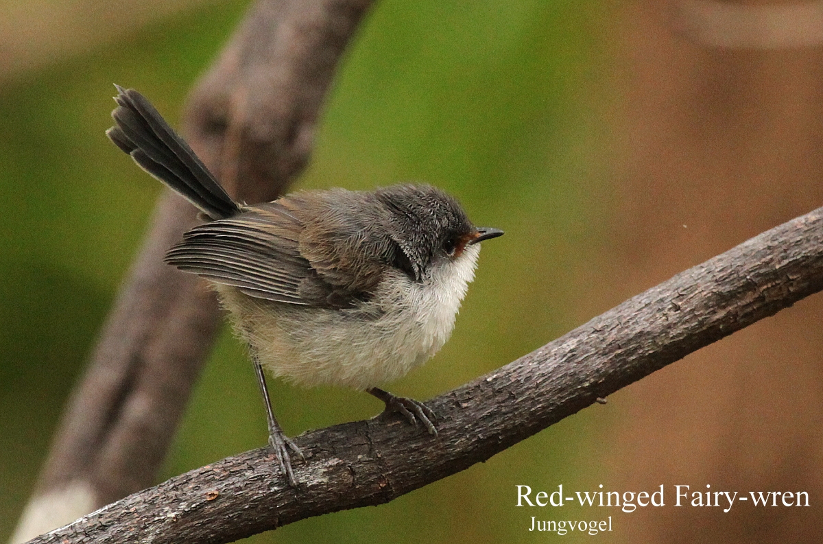 Dafür sah ich aber, wie eine ganze Familie Red-winged Fairy-Wrens durch die Zweige hastete. Einmal kam ein Jungvogel, sich noch unsicher in der Luft haltend, direkt auf mich zu und streifte dabei fast meinen Hut. Ein Western Rosella, gar nicht scheu, kletterte durch die dichten Zweige eines kleinen Busches direkt über unseren Köpfen. |