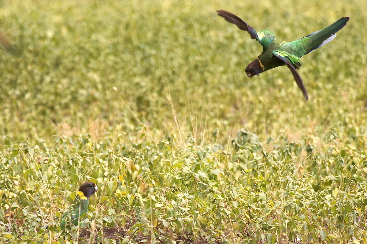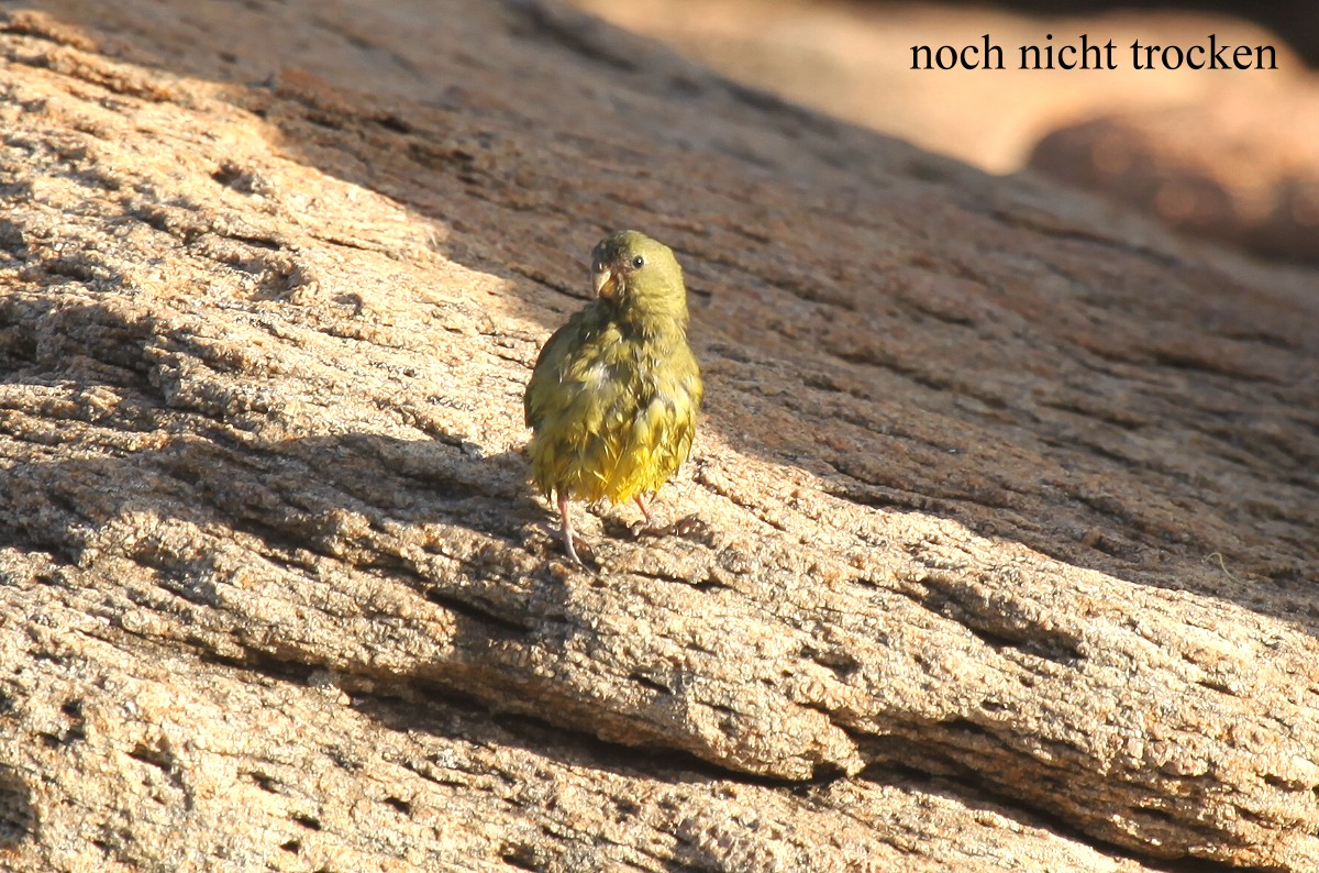 Erst als wir unsere Runde fast beendet hatten tauchten plötzlich in schnellem Flug 5 Rock Parrots auf, die sich direkt am Wasserloch niederließen und badeten. Die Fotos, die Tomoko machte, zeigten fast nur patschnasse Vögel, deren Gefieder im Licht der aufgehenden Sonne leuchteten. |