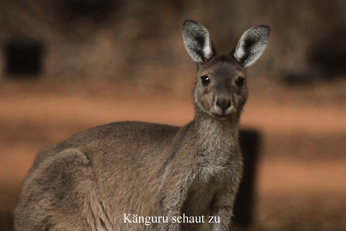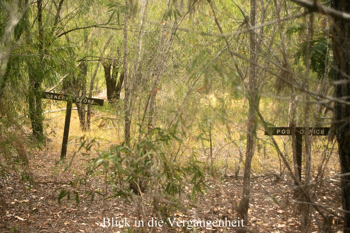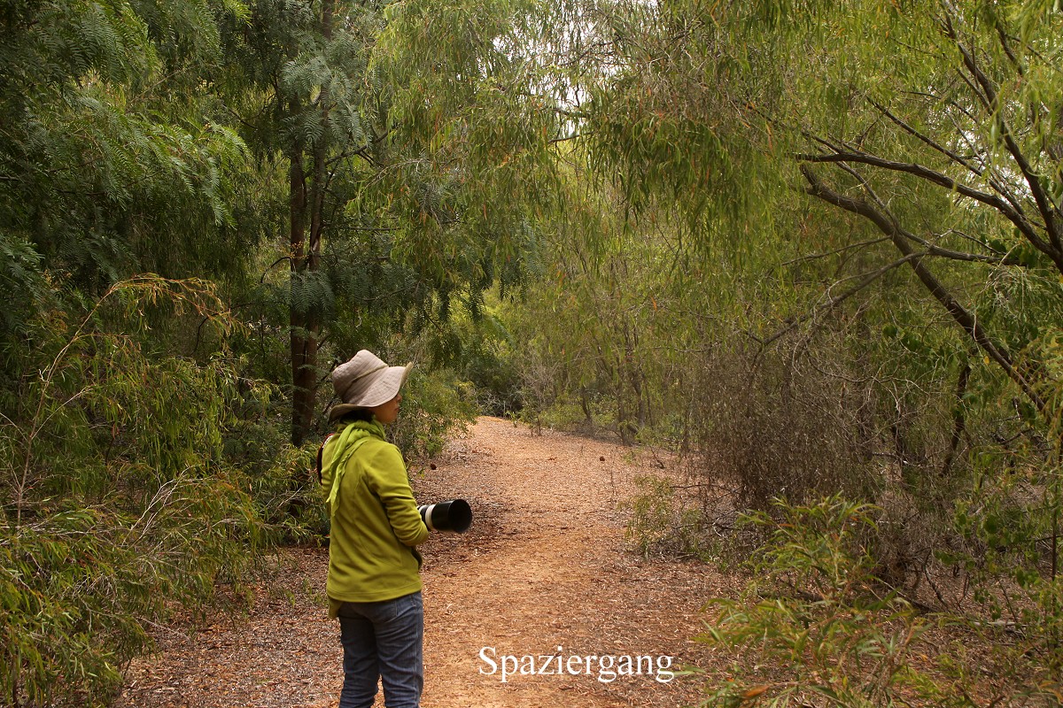 Um 13.45 h erreichten wir nach einigen hundert Metern den Campingplatz, der wunderschön inmitten des Waldes unter dichten hohen Bäumen liegt. Nachdem wir uns registriert hatten (9,- $ pro Person), das Geld in einen Umschlag gesteckt und in eine eiserne Box geworfen hatten, suchten wir uns einen einsamen Platz aus, der nur für kleinere Fahrzeuge wie das unsrige erreichbar ist. Gleich neben unserem Stellplatz hatten wir einen stabilen Holztisch mit 2 Bänken, wo wir zunächst mal Kaffee kochten und unseren mitgebrachten Kuchen aßen. Anschließend um 15.10 h brachen wir zu einem Spaziergang in die nähere Umgebung auf. Ein schmaler Fußweg führte mitten durch den lichten Wald. Als wir ihm folgten trafen wir auf einige merkwürdige Schilder "Post Office", "General Store", "Tennis Court", inmitten der Bäume. Wie wir später erfuhren, wurde hier mal in den 40-er Jahren eine kleine Siedlung gegründet, wo Arbeiter wohnten, die in der Holzindustrie arbeiteten, als der Holzbedarf nach dem 2.Weltkrieg stieg. Die Siedlung bestand aus rund 90 Gebäuden, wurde aber 1968 wieder abgerissen. Heute liegt der Campingplatz auf diesem Gelände und alles ist von schnellwachsenden jungen Bäumen und Gebüsch überwuchert. Wir wanderten langsam weiter. Einige Kängurus hüpften vor uns davon. Ein Kookaburra lachte wieder laut. Einige kleine Fairy-Wrens waren auf Futtersuche und einige Black-Cockatoos flogen über uns hinweg. Tomoko entdeckte auch einen Western Yellow Robin, leider waren die Fotos nicht scharf. |