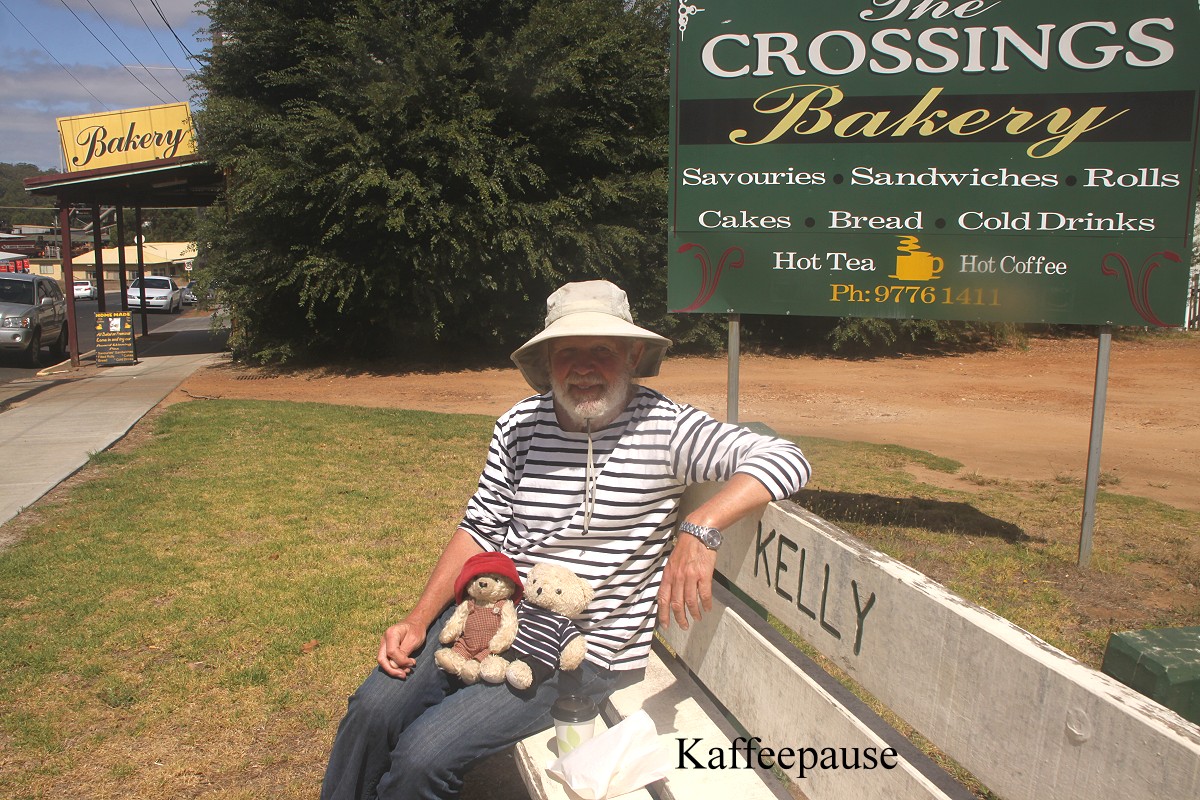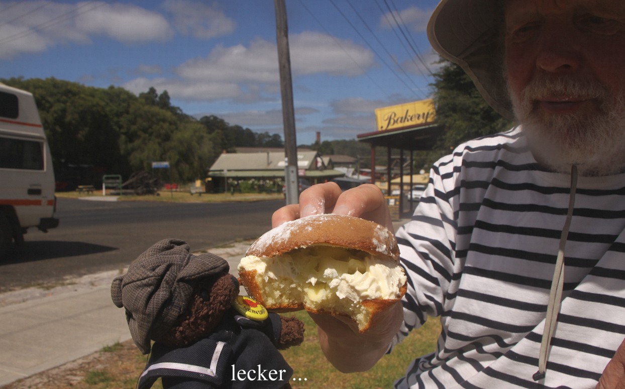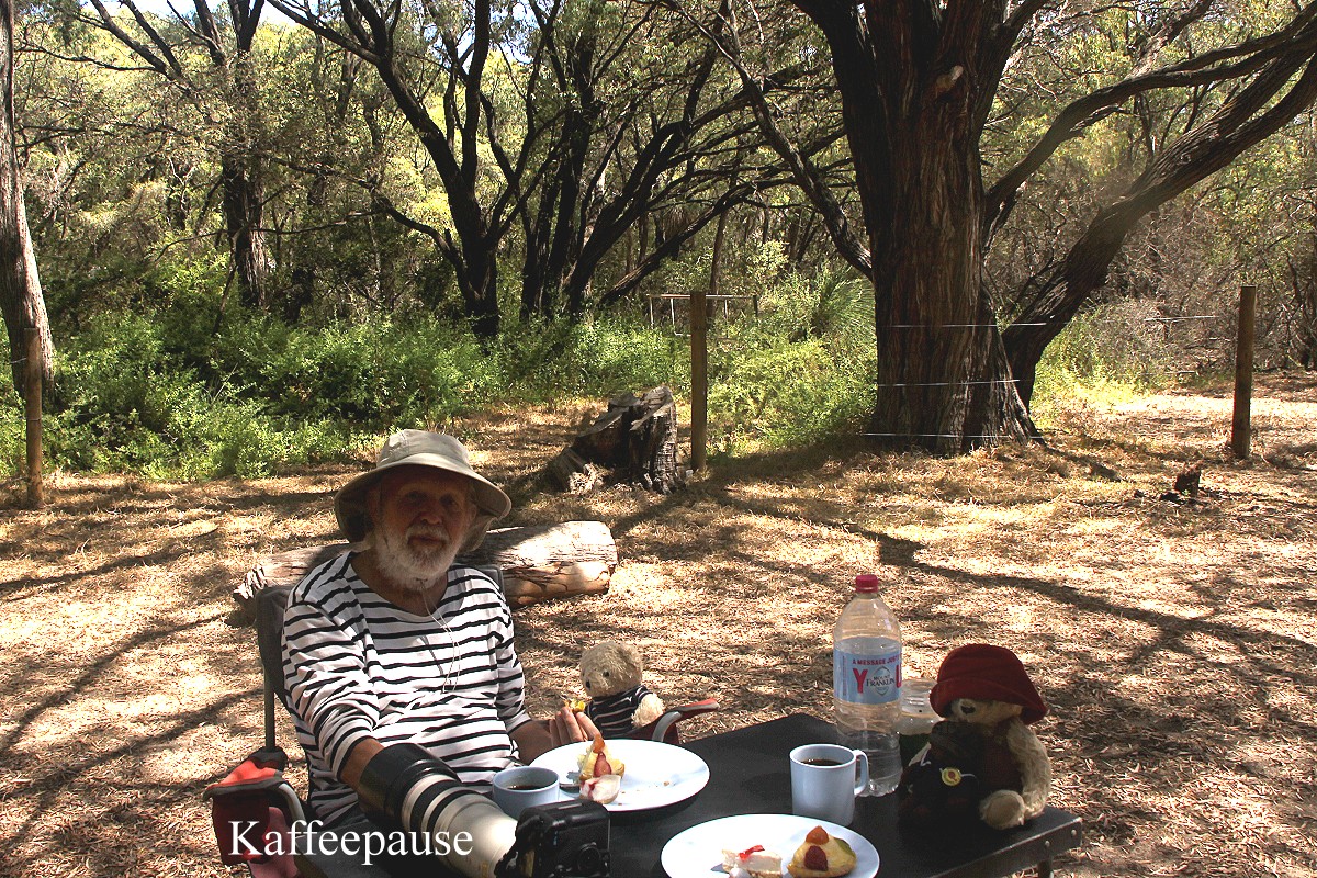 Inzwischen wurde es deutlich wärmer (24°), der Himmel bekam wesentlich mehr große blaue Stellen und die Wolken wurden immer kleiner. Um 10.30 h erreichten wir Pemberton, neben Northcliff die einzige Ortschaft auf dem 200 km langen Weg nach Augusta. An einer Bäckerei hielten wir an. Tomoko ging hinein und kaufte ein leckeres Stück Kuchen und einen Cappuccino. Beides teilten wir draußen auf einer Bank sitzend. Das schmeckte so gut, dass ich noch ein zweites Stück Kuchen kaufte. |