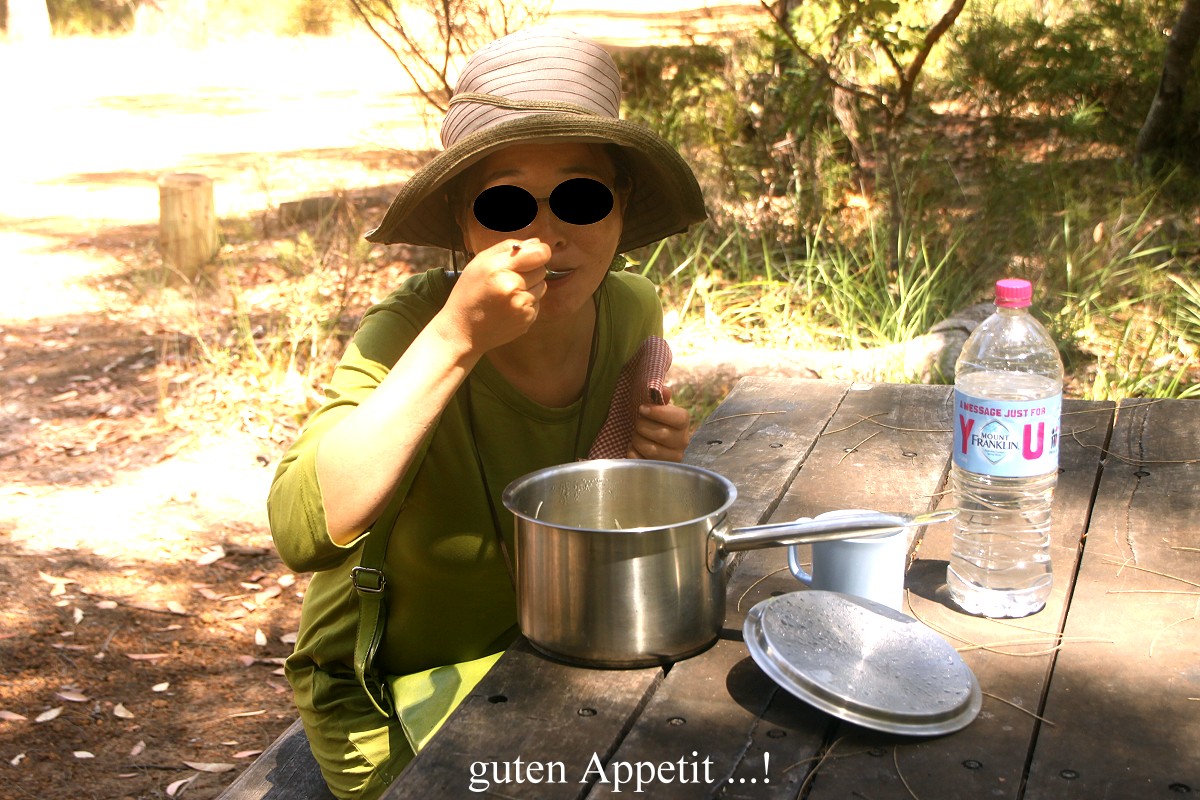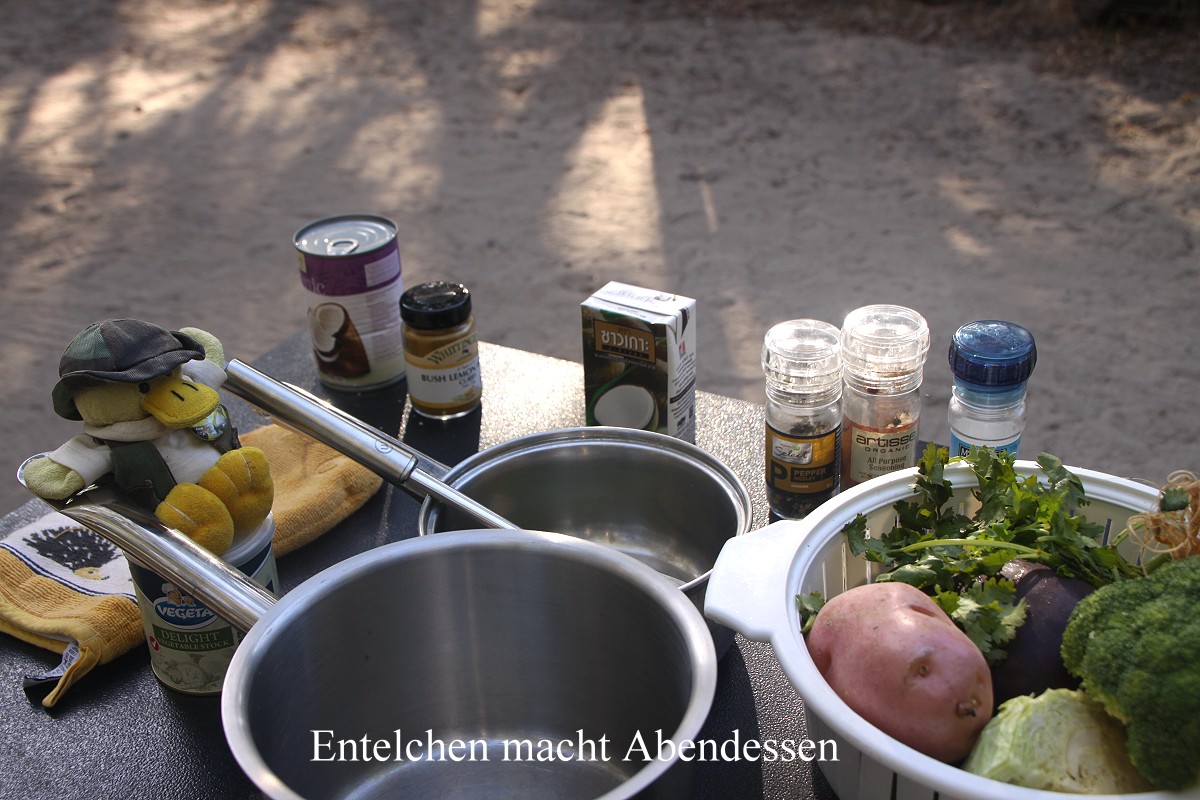 Nun wurde es langsam Zeit fürs Abendessen. Heute kochten Entelchen (Chefkoch) und Tomoko Gemüse mit Bush Lemon Myrtle Curry (ein typisch australisches Gewürz ) in Kokusnussmilch mit Reis, sehr lecker… Das dazugehörige Bier versteckte Entelchen in einer Serviette, da wir am Eingang des Campingplatzes gelesen hatten, dass alkoholische Getränke verboten sind, merkwürdig… Ein Kookaburra flog heran und setzte sich in der Nähe auf einen Ast. |