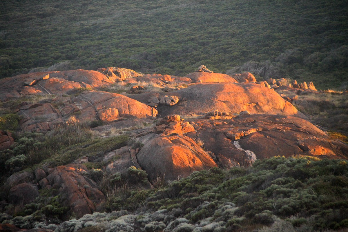 Wie gewöhnlich wachten wir beim ersten Tageslicht auf. Ich war schon gegen 5.00 h wach, Tomoko erst eine halbe Stunde später. Da wir sehr früh wieder zum Cape Leeuwin wegen der Rock Parrots fahren wollten, standen wir schnell auf, zogen uns an, schlossen die Türen sehr leise, um die Nachbarn nicht zu stören und fuhren um 5.45 h los. Kurz nach 6.00 h kamen wir am alten Mühlrad an. Wir stiegen zunächst nicht aus, sondern beobachteten das Wasserloch davor aus dem Auto. Nach kurzer Zeit tauchte ein Rock Parrot am Boden auf, war aber im noch nicht sehr hellen Morgenlicht schlecht zu erkennen und flog auch bald weg. Ich stieg aus und setzte mich etwas abseits auf einen Felsen. |