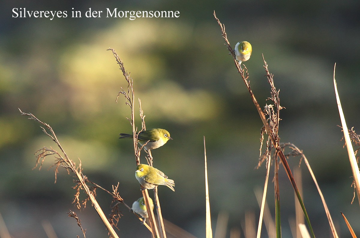 Um 5.30 h wurden wir wach und standen auch gleich auf. Es war sehr bewölkt, zwischen einigen Wolkenlücken schimmerte das Licht der aufgehenden Sonne durch. Wir bereiteten das Frühstück vor und sofort näherten sich wieder 2 Enten, deren Schar sich im Verlauf des Frühstücks auf 6 vergrößerte. Eine von ihnen, offensichtlich die von gestern Abend, ging immer wieder aggressiv auf ihre Artgenossen los und versuchte sie zu verscheuchen, was ihr aber nicht gelang. Auch die kleinen Brillenvögelchen (Silvereyes) und einige Tauben (Common Bronzewing) kamen wieder zu uns. |