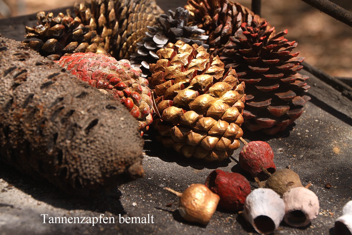 Das Wetter war immer besser geworden, die Temperatur betrug 28°. Die Gegend ist bekannt für ihre zahlreichen Tropfstein-Höhlen. Bei einer Höhle, der "Lake Cave" machten wir kurz halt. Da man hier nur Besichtigungen in Begleitung eines Führers machen kann, verzichteten wir darauf und beschlossen, lieber morgen die am Weg liegenden "Mammuth Caves" zu besuchen, in denen man sich frei bewegen kann. Gleich in der Nähe zeigte ein Hinweisschild einen nahen Campingplatz an, "Conto Camping". Hier fanden wir einen schönen geräumigen Stellplatz mit Tisch und Sitzbänken an einer ziemlich abgelegenen Stelle. An der Feuerstelle fanden wir eine Haufen bunt angemalter Tannenzapfen, die wohl andere Camper vor uns hier zurückgelassen hatten. Wir machten bald Kaffee und auch einen kleinen Kuchenteller stellte Tomoko bereit. So ließen wir es zunächst mal gemütlich angehen. |