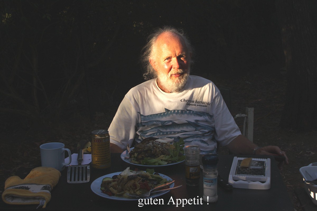 Also fuhr ich trotz Müdigkeit noch mal los ins 8 km entfernte Dunsborough, wo ich im dortigen COLES-Supermarkt zwei 6-Packs XXXX-Bier kaufte, was wohl für den Rest der Reise reichen sollte. COLES dort ist übrigens an 7 Tagen der Woche rund um die Uhr geöffnet, ich weiß nicht, ob das in ganz Australien der Fall ist. Als ich zurückkam, hatte Tomoko inzwischen das Abendessen fertig zubereitet. Es gab Fettucini mit marinierten Auberginen und Zucchini mit sun-dried tomatoes, garniert mit etwas Sour-Cream, sehr lecker. |