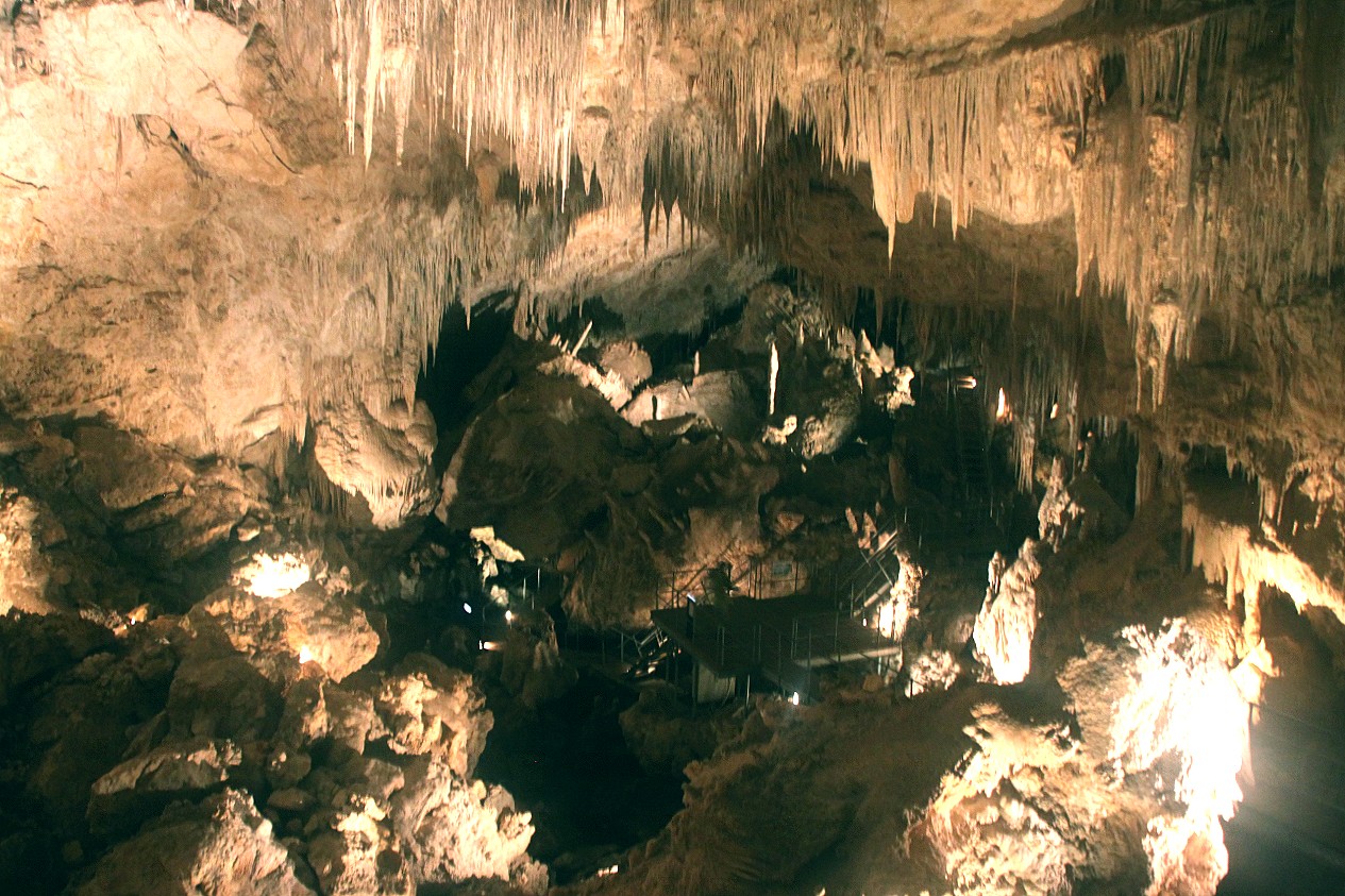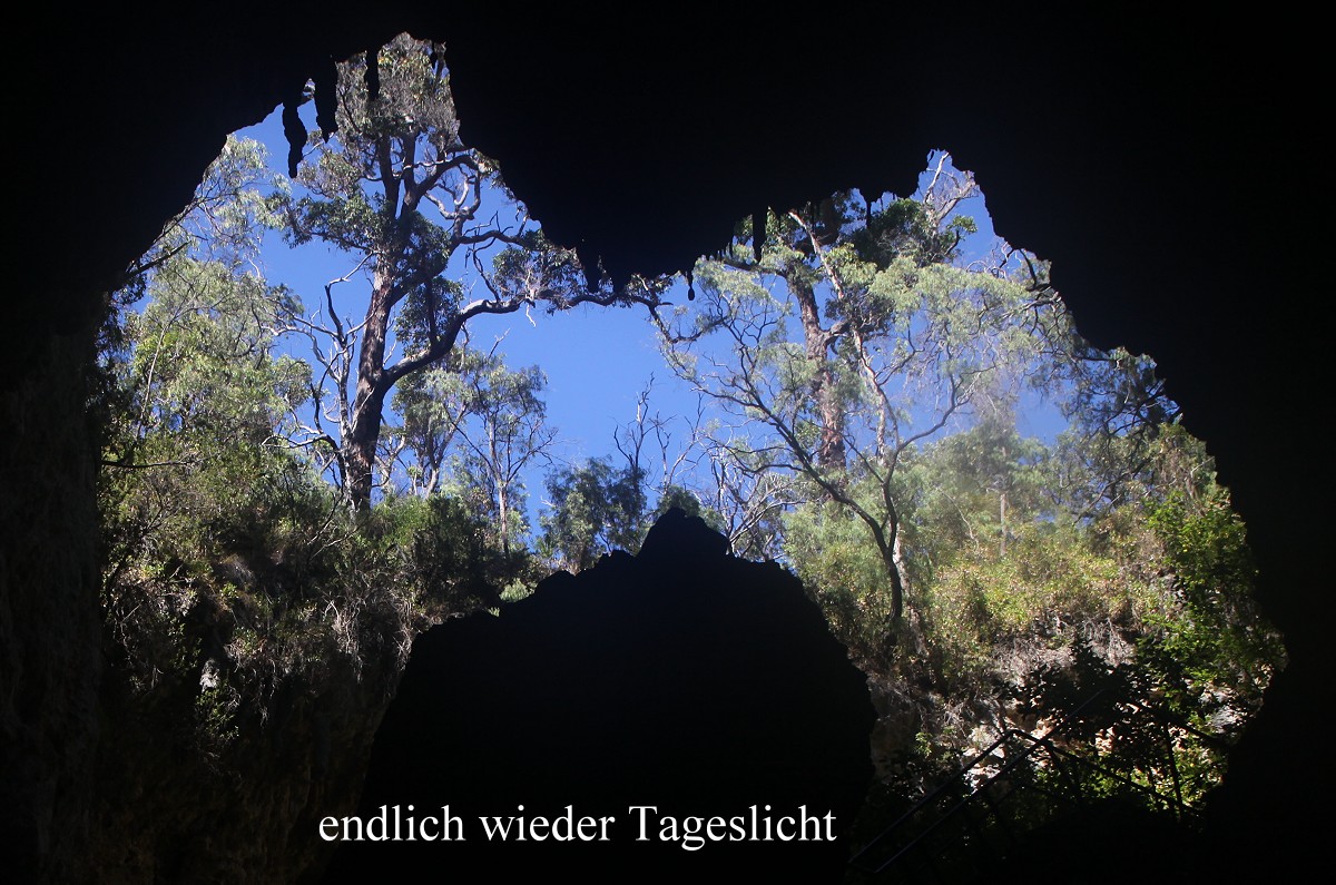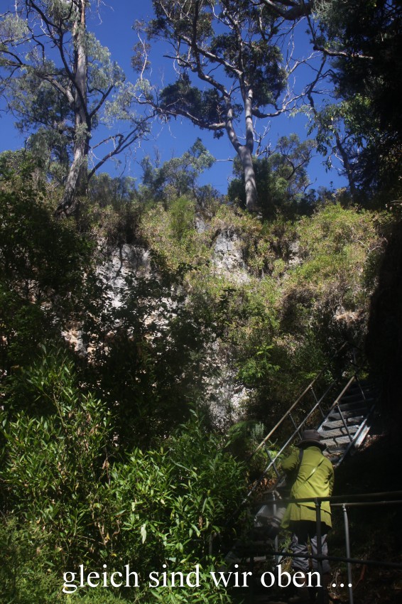 Ich hatte zur Sicherheit meine Taschenlampe eingesteckt, man weiß ja nie… Immer wieder waren kurze steile Treppen zu bewältigen und es gab immer neue faszinierende Ausblicke auf die zahlreichen Jahrmillionen alten Stalaktiten und Stalagmiten. Es war ziemlich feucht und kühl in der Höhle. Etwa eine Stunde dauerte unsere Wanderung, die am Ende über eine 160-stufige steile Treppe wieder ans Tageslicht führte. |