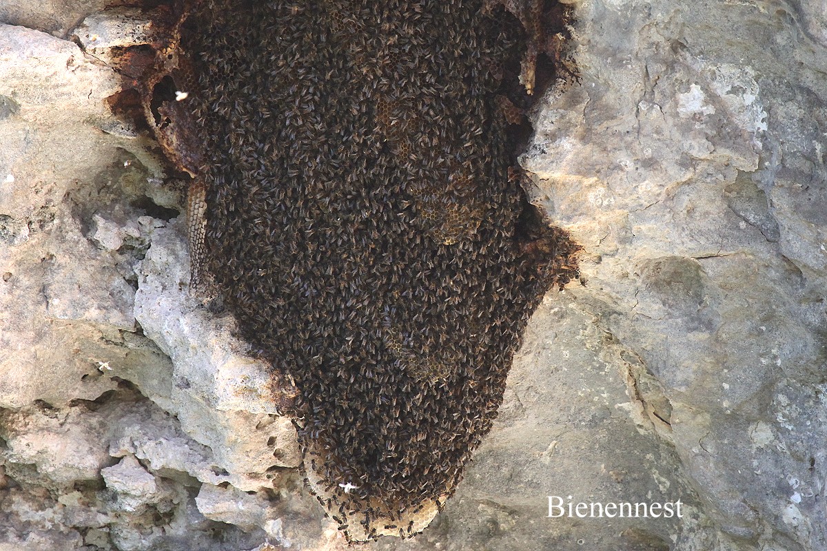 Am Ausgang konnten wir zwei riesige Bienennester bewundern, die fest an einem Felsvorsprung klebten. |