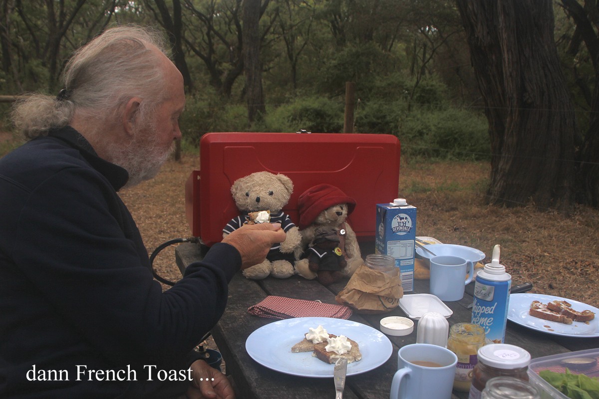 Heute wachten wir für unsere Gewohnheit ziemlich spät auf, erst um 6.30 h. Es war schon taghell und die Sonne schien. Über Nacht war es auf 23° abgekühlt, sehr angenehm. Zum Frühstück gab es heute u.a. wieder French Toast, worüber unsere Bären sich sehr freuten. |