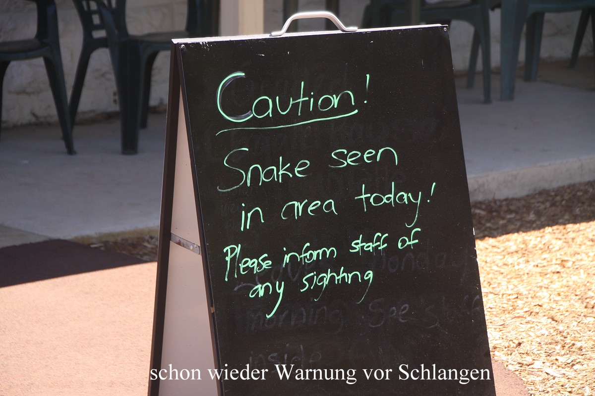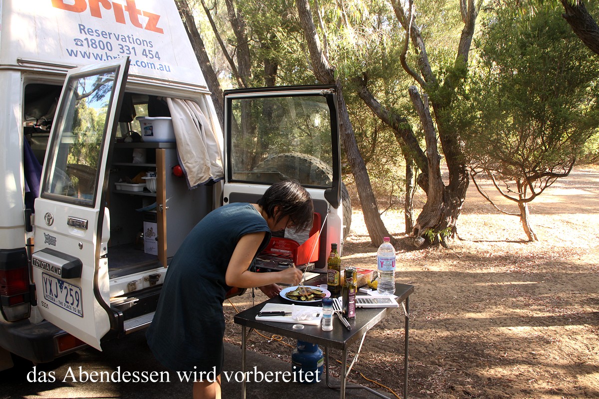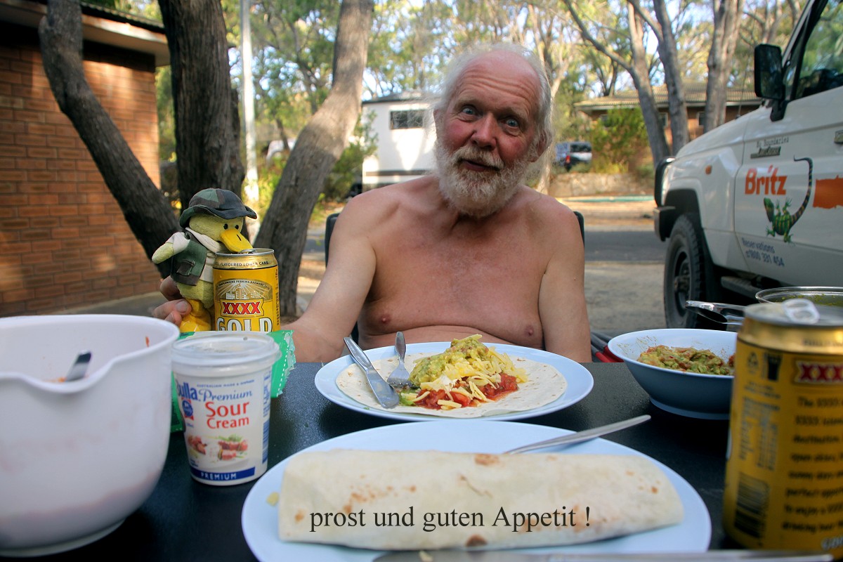 So bequem habe ich in meinem ganzen Leben noch nie in einem Café gesessen. Wir wollten gar nicht mehr aufstehen, aber die Sorge, vielleicht keinen schönen Platz zum Übernachten mehr zu finden, veranlasste uns schließlich doch zu gehen. Wir hatten aber Glück und erhielten den gleichen Stellplatz wie gestern. Das war um 15.45 h. Der Campingplatz war wesentlich leerer. Viele Gäste, die nur über das Wochenende aus Perth und Umgebung angereist waren, waren schon wieder auf dem Heimweg. Ich nutzte unseren Wasseranschluss und nahm erst mal eine erfrischende Dusche aus dem Wasserschlauch neben unserem Auto. Tomoko fing schon mit den Vorbereitungen zum Abendessen an, während ich mit meinem Tagebuch begann. Zwischenzeitlich duschte Tomoko auch. Um 17.30 h war das Essen fertig. Diesmal gab es Wraps mit mexikanischen Zutaten wie Tomaten-Salsa-Sauce, Guacamole, Bohnenpürree, Cheddar Käse und Sour Cream. Die Schärfe war genau richtig. Gut, dass wir vorher die Chilischote auf ihre Schärfe gecheckt hatten. Sie war richtig scharf, so dass Tomoko nur ein kleines Stück unter die Tomaten mischte. Ein kühles Bier schmeckte bei der immer noch großen Hitze toll dazu. Während wir aßen, sah Tomoko plötzlich, wie eine Maus aus einem Abflussrohr neben unserem Stellplatz herausschaute, niedlich ... |