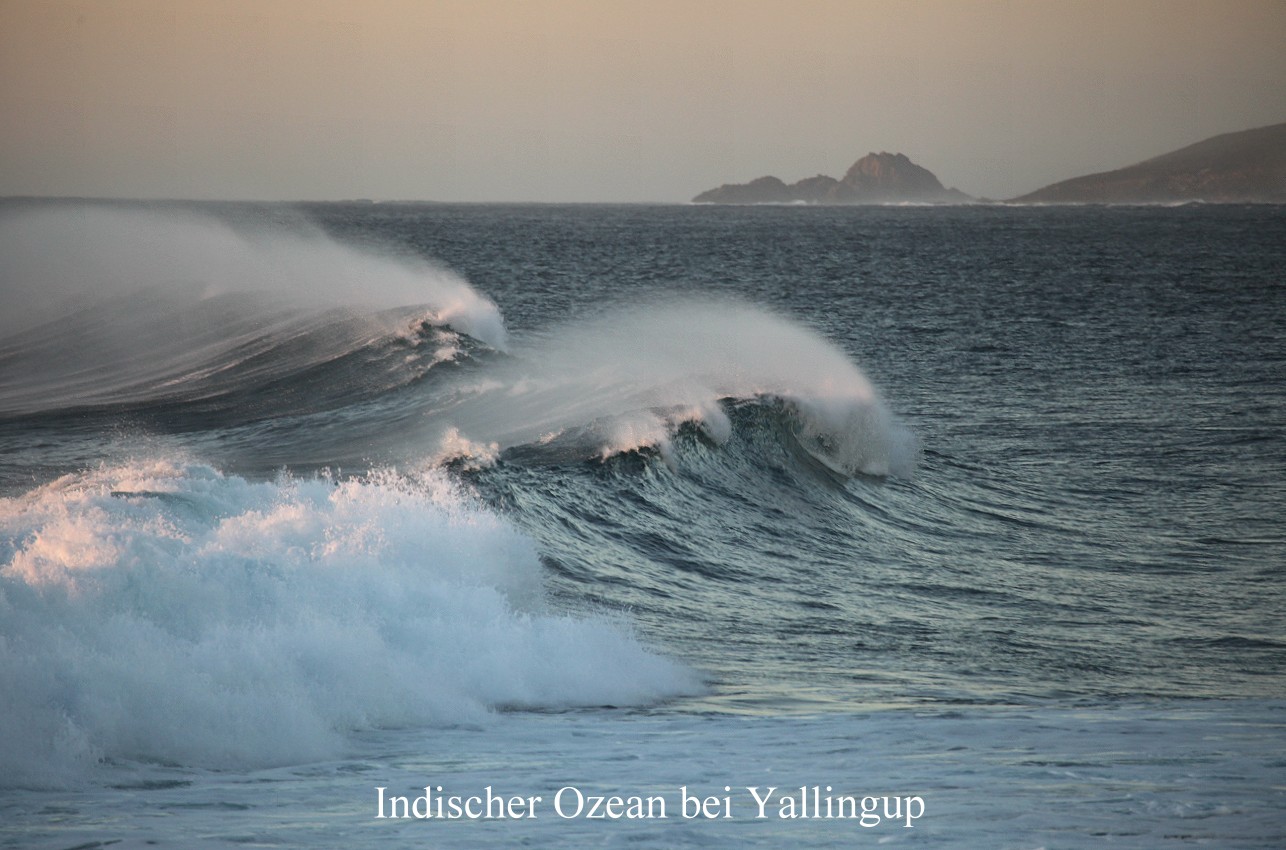 Um 10.50 h fuhren wir weiter. Nach wenigen km erreichten wir die Abzweigung nach Prevelly Beach, wo wir nach weiteren 4 km ankamen. Prevelly Beach ist unter Surfern weltweit bekannt wegen seiner grandiosen Riesenwellen. Was wir sahen war in der Tat großartig. |