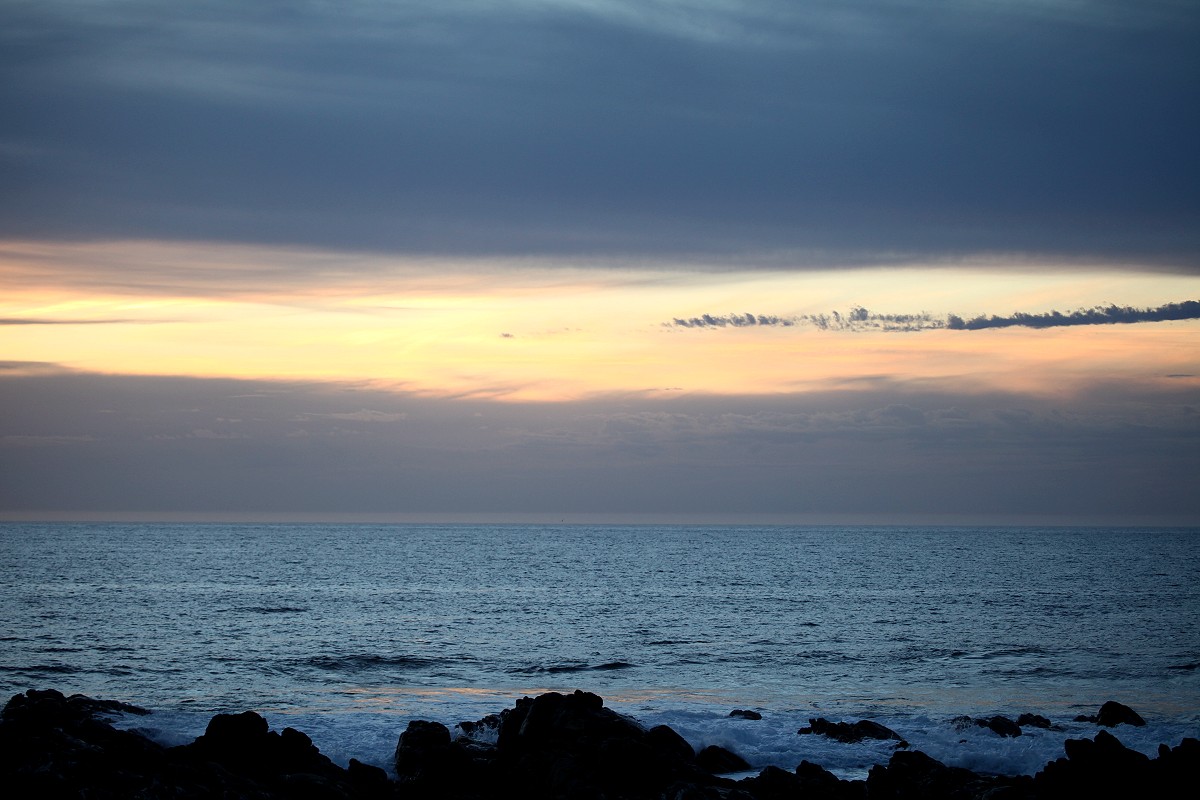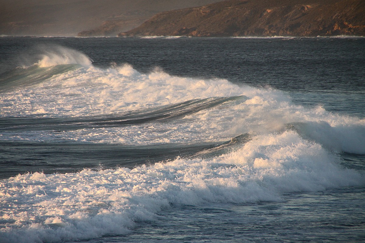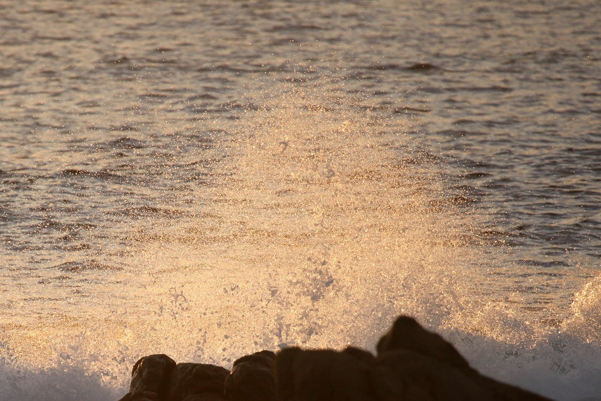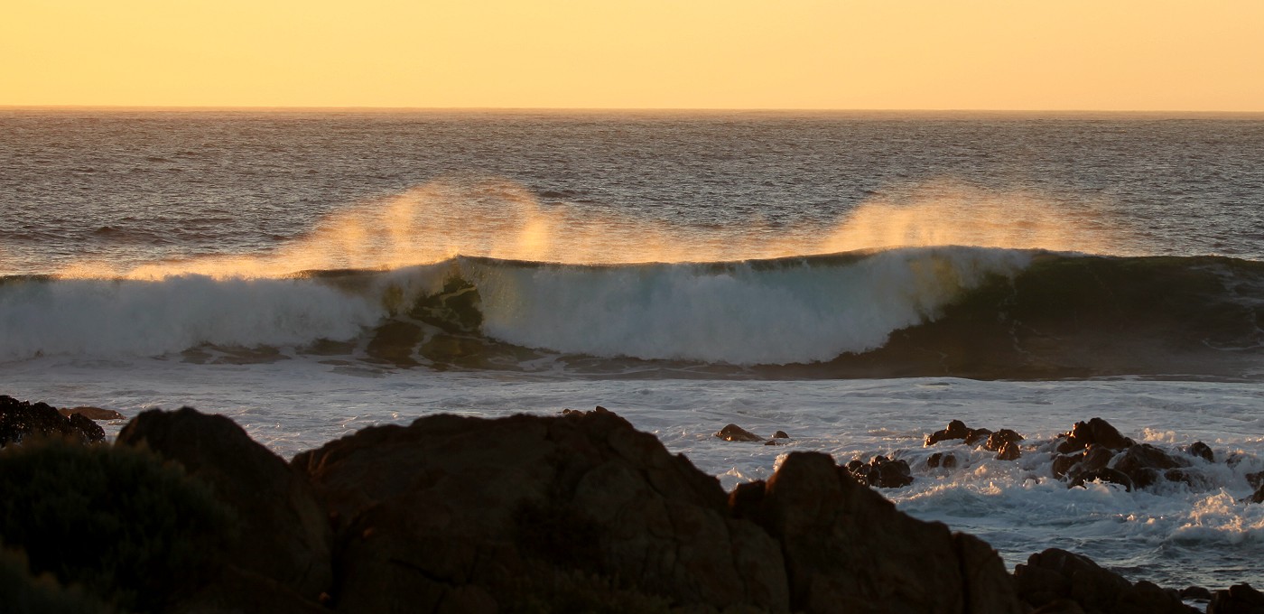 Da der wolkenlose Himmel einen schönen Sonnenuntergang am Meer versprach, verschoben wir das Spülen auf später und fuhren kurz vor 19.00 h schnell die 2 km hinunter bis zum Strand. Auf einem kleinen Parkplatz warteten schon einige Leute. Auch hier war die Brandung ziemlich stark und die Gischt schäumte hoch im Licht der untergehenden Sonne. |