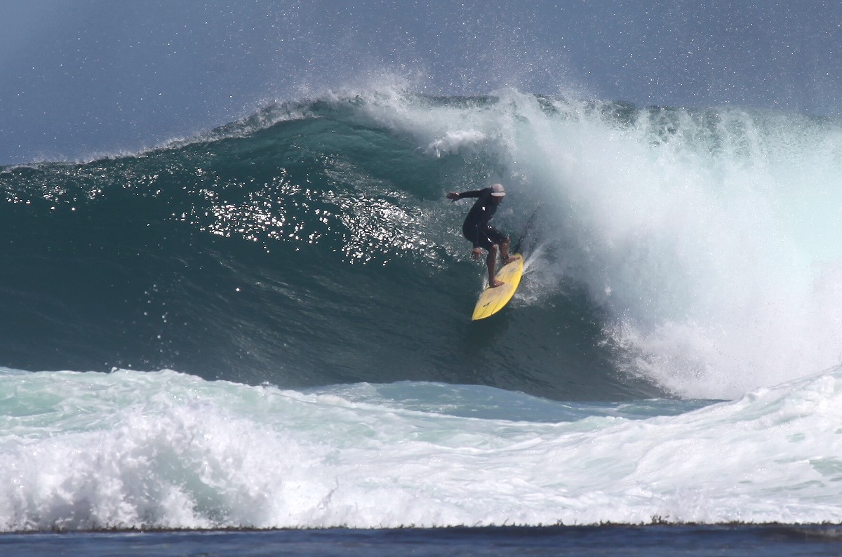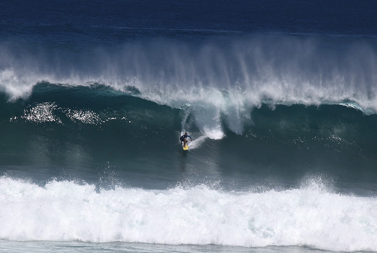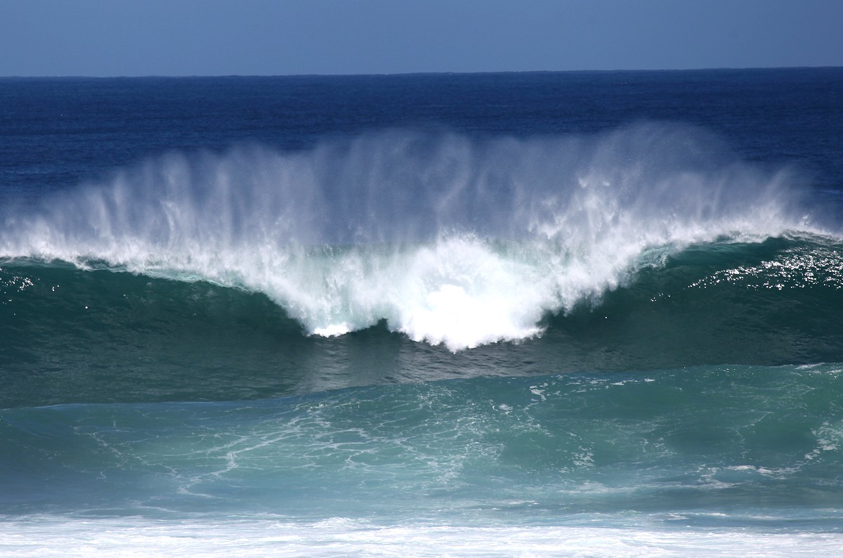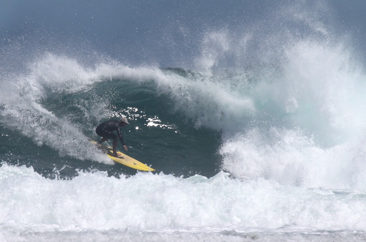 Von einem Parkplatz 30-40 m über dem Meer konnten wir beobachten, wie zahlreiche Surfer in der Brandung mit ihrem Surfbrett auf die nächste Riesenwelle warteten, sich blitzschnell aufrichteten und auf der Welle dahinglitten. |