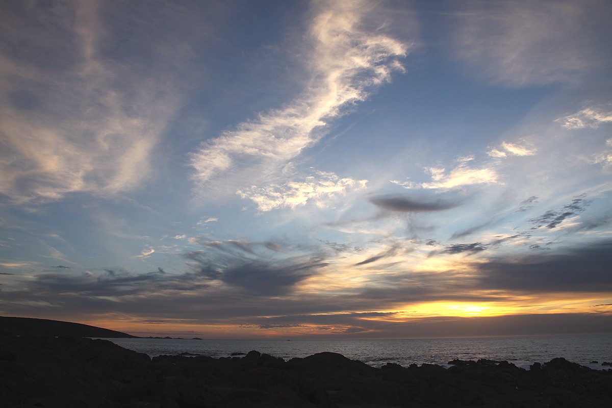 Ich spülte noch das schmutzige Geschirr. Um 18.30 h waren wir startbereit, um noch mal den Sonnenuntergang zu erleben. Heute war der Himmel im Westen sehr bewölkt, so dass ein ganz anderer Eindruck entstand, malerischer als gestern, sehr stimmungsvoll... |