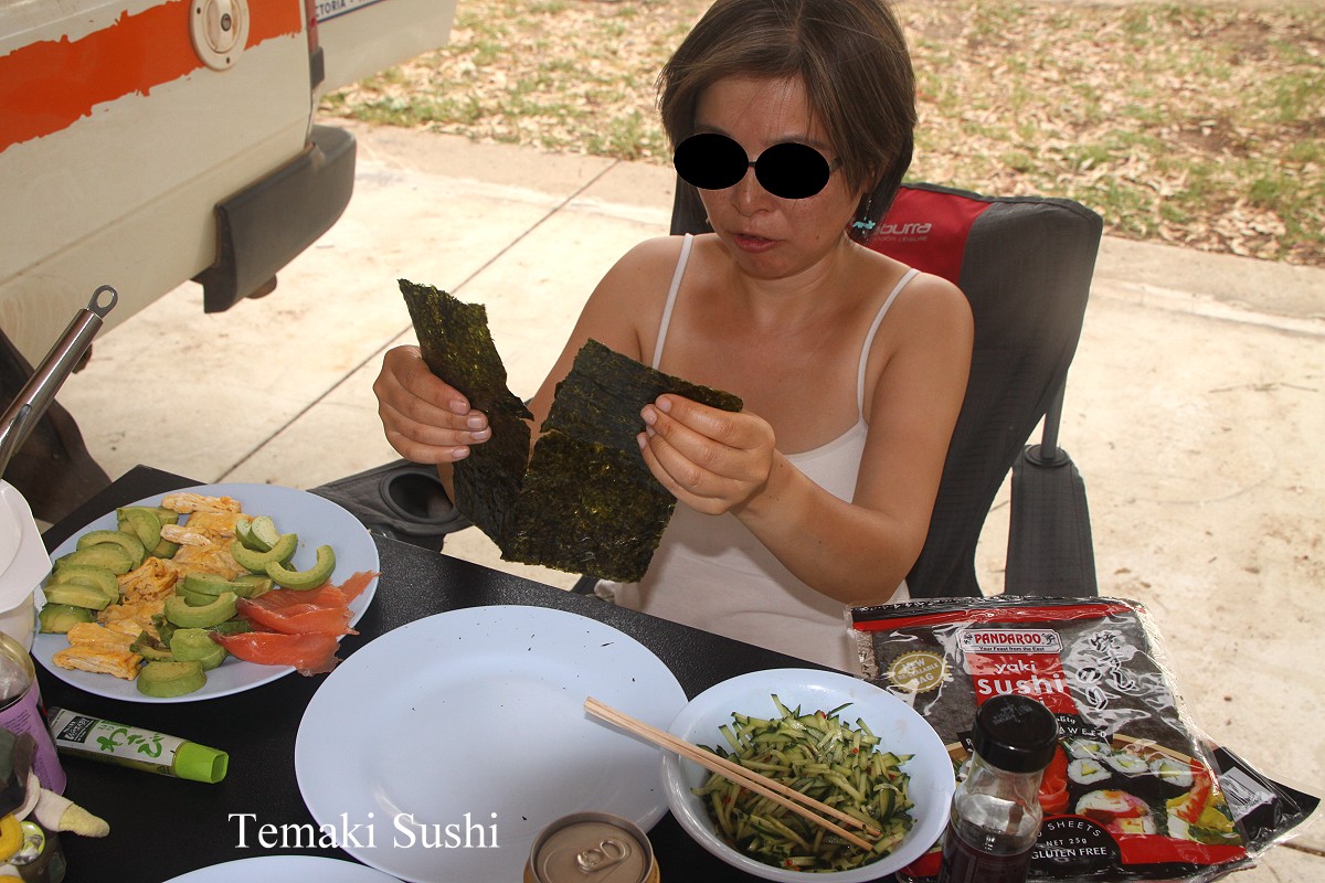 Es war immer noch sehr heiß, so um die 33°. Ich schloss unseren Wasserschlauch an und ließ mir einfach das kühle Nass über den Körper laufen, sehr erfrischend… Tomoko bereitete das Abendessen vor. Heute stand Temaki-Sushi auf dem Speiseplan. Ich musste heute auf den kochenden Reis aufpassen, was mir hervorragend gelang, so dass ich ein dickes Lob von der Köchin bekam. Insgesamt schmeckte alles wunderbar, auch das eiskalte Bier dazu aus dem Kühlschrank. |