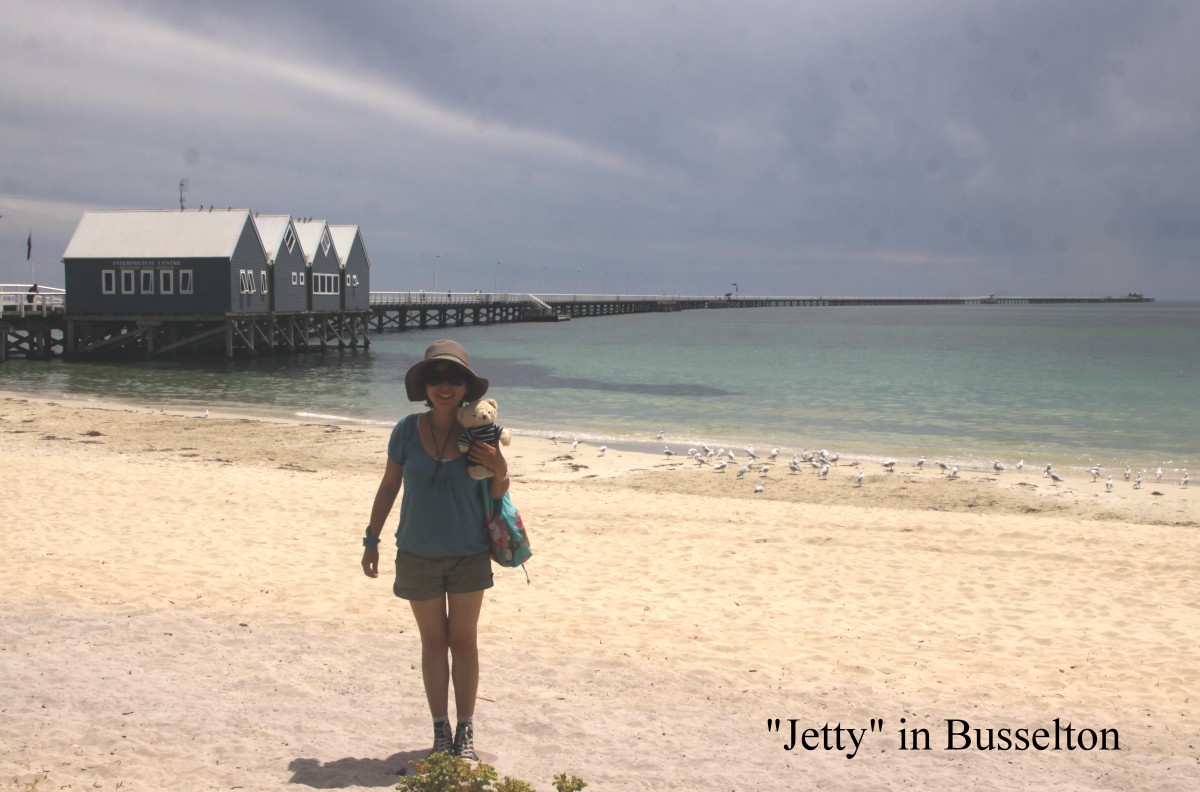 Inzwischen wurde es immer heißer, so dass wir die Klimaanlage einschalten mussten. Um 11.00 h erreichten wir Busselton, eine touristisch sehr entwickelte Stadt an der Geographe Bay. Hier suchten wir zunächst einen Parkplatz, was auf Grund des starken Verkehrs gar nicht so einfach war. Ein Woolworths- Supermarkt war in der Nähe, wo wir ein paar Dinge einkauften. Vor allem unsere Wasservorräte schmolzen in der Hitze dahin. Inzwischen war es 36° heiß, so dass uns der klimatisierte Supermarkt sehr willkommen war. Anschließend besuchten wir gegenüber eine Bäckerei, die mir aufgefallen war. Mein Bienenstich schmeckte gut, Tomokos Apple Custard weniger. Überhaupt war das ganze nicht gemütlich mit Pappbechern, ohne Teller… Direkt gegenüber hatte Tomoko ein viel besseres Café gesehen, da ich mir aber so sicher war, etwas Gutes gefunden zu haben, sagte sie nichts. Nun ja, zu spät…Wir schauten uns noch den Strand an. Hier geht ein langer Steg (Jetty) 1.837 m weit ins Meer, nur befahrbar mit einem kleinen Bähnchen. Dort am Ende befindet sich ein Unterwasserobservatorium. Dorthin fuhren wir aber nicht, es war einfach zu heiß, obwohl der Himmel inzwischen ziemlich wolkenverhangen war. Beim Weg zur Toilette entdeckte Tomoko neben dem Strand zahlreiche Papageien (Little Corellas) in einem Baum sitzen. |