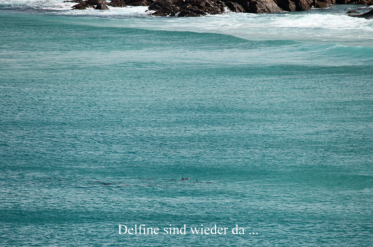 Hier ließen wir uns auf einer kleinen Steinmauer nieder. Plötzlich hatte Tomoko etwas im Meer entdeckt, ja tatsächlich, dort schwammen einige Delfine, mindestens 7 Exemplare, in der Brandung herum. Mit unseren Ferngläsern konnten wir beobachten, wie sie munter im Wasser sich bewegten, manchmal die heranrollenden Wogen elegant überspringend. |