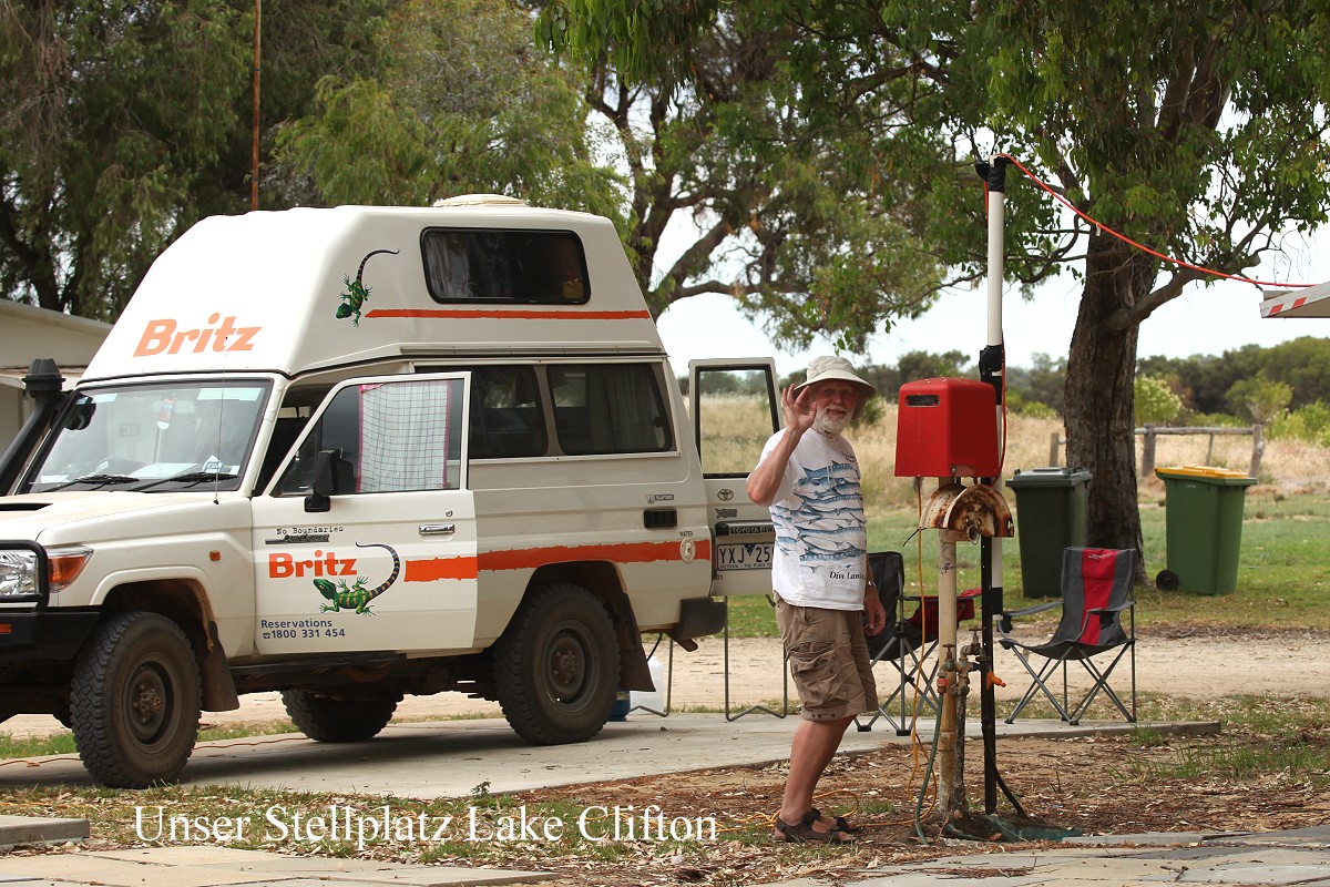 Um 12.30 h fuhren wir weiter Richtung Bunbury. Diese Stadt streiften wir nur im Vorbeifahren, wobei wir natürlich keinen richtigen Eindruck bekamen. Einige km weiter nördlich wollten wir uns einen Campingplatz zum Übernachten suchen. Der erste in Billingup machte einen trostlosen Eindruck. Wir hatten ihn nur mit großer Mühe gefunden, keinerlei Hinweisschilder innerhalb des Ortes. Der Ort selbst wirkte wie ausgestorben, nur zahlreiche Papageien saßen auf den hohen Antennen der umliegenden Häuser. Schnell fuhren wir weiter einige km bis zum nächsten Ort Myalup . Doch auch dieser Platz gefiel uns nicht. Das scheint ja ein Problem heute zu werden. Wir fuhren weiter bis zum Lake Clifton. Hier wurden wir endlich fündig. Ein schöner Platz etwas abgelegen im Yalgorup NP, aber sauber und ziemlich leer. Wir installierten uns am äußersten Rand und bekamen bald Besuch von zahlreichen Papageien. Zunächst kamen Galahs in großer Zahl, die versuchten aus verschiedenen tropfenden Wasserhähnen Wasser zu trinken. |