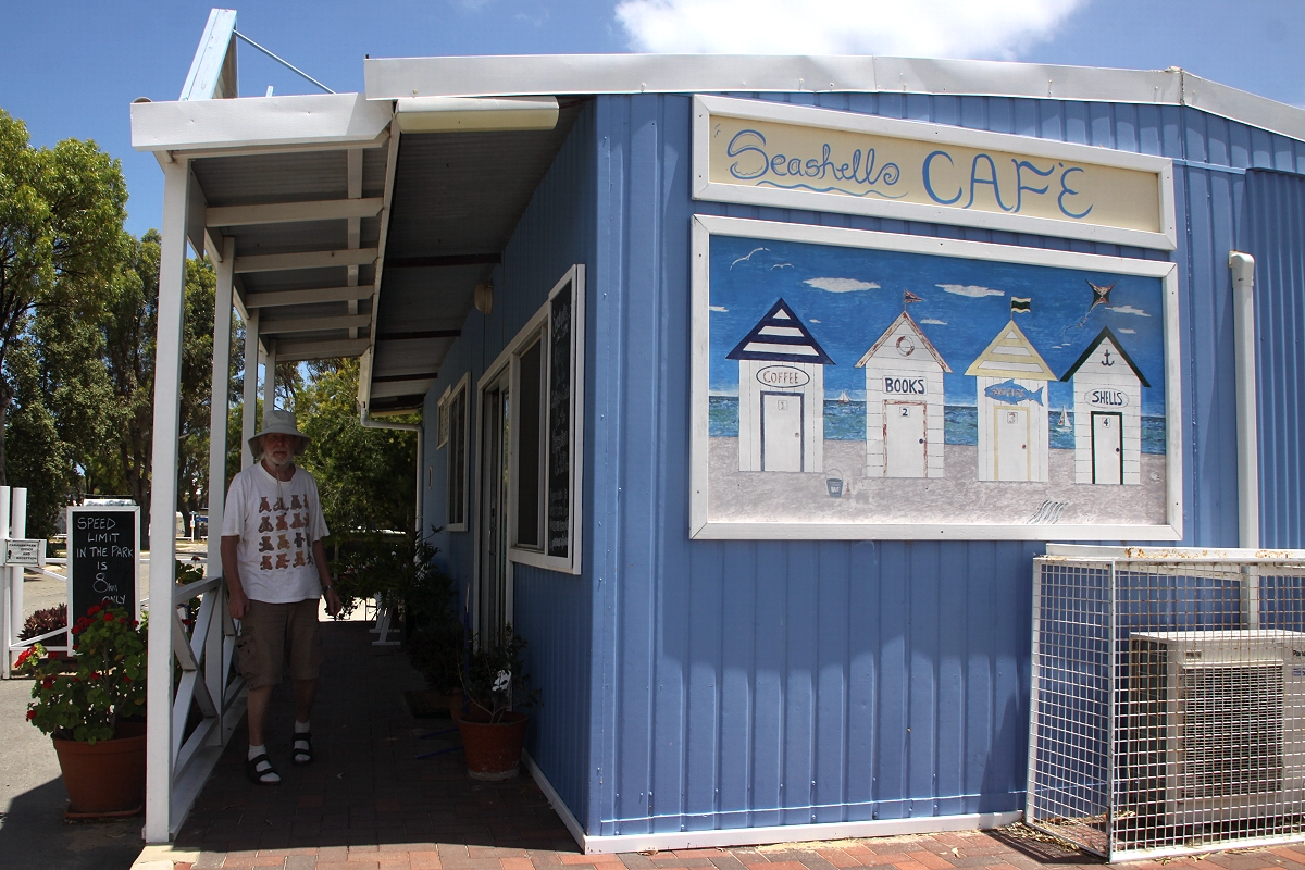 Am Ende des Rundwegs parkten wir das Auto in der Nähe des Info-Centers. Ich kaufte mir dort einen Autoatlas von Westaustralien, in dem auch die unbefestigten Straßen im Outback alle eingezeichnet sind. Diesen werden wir sicher in den nächsten Tagen noch brauchen. Um 12.50 h brachen wir auf und fuhren 17 km nach Cervantes, einem kleinen Ort am Ozean. Auf der Suche nach einem Café wurden wir am Caravan Park direkt am Strand fündig. Es gab leckeren Kuchen und Cappuccino. |
