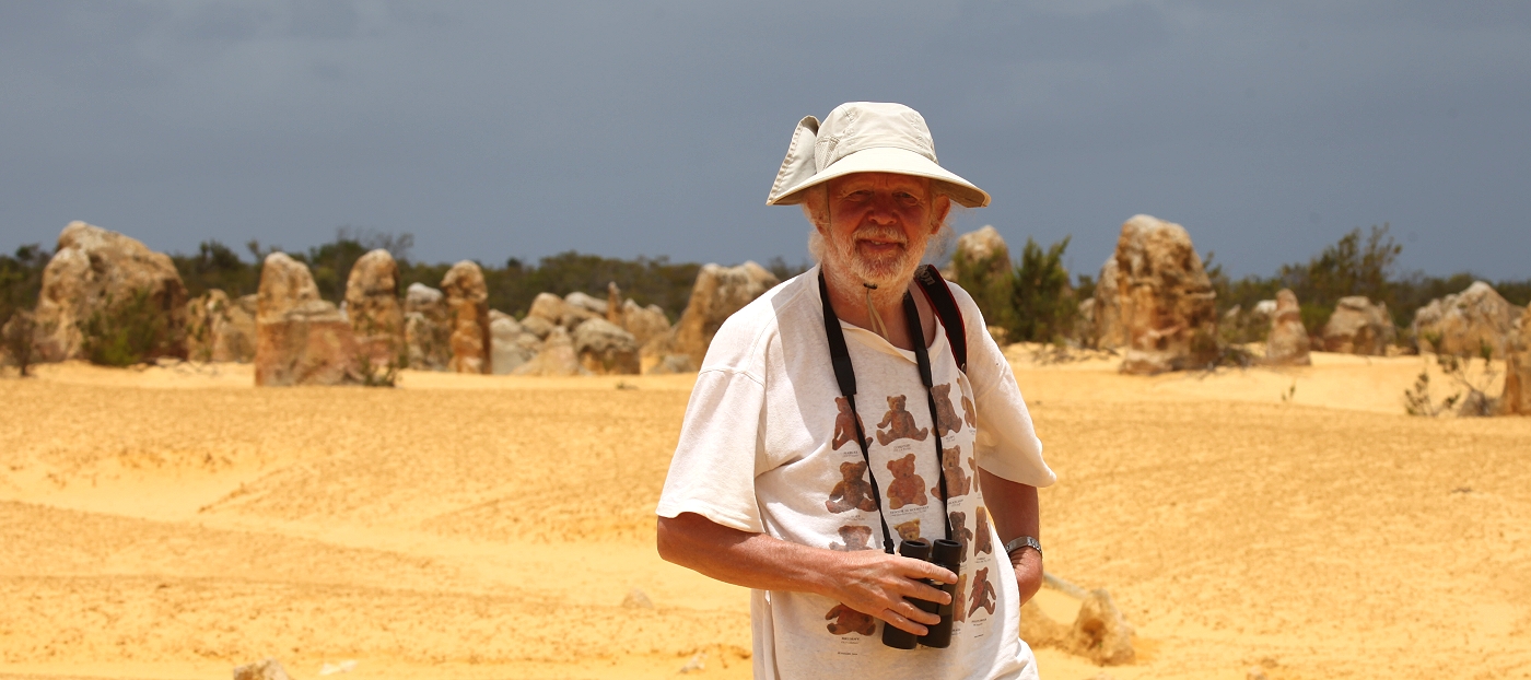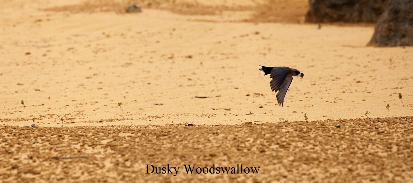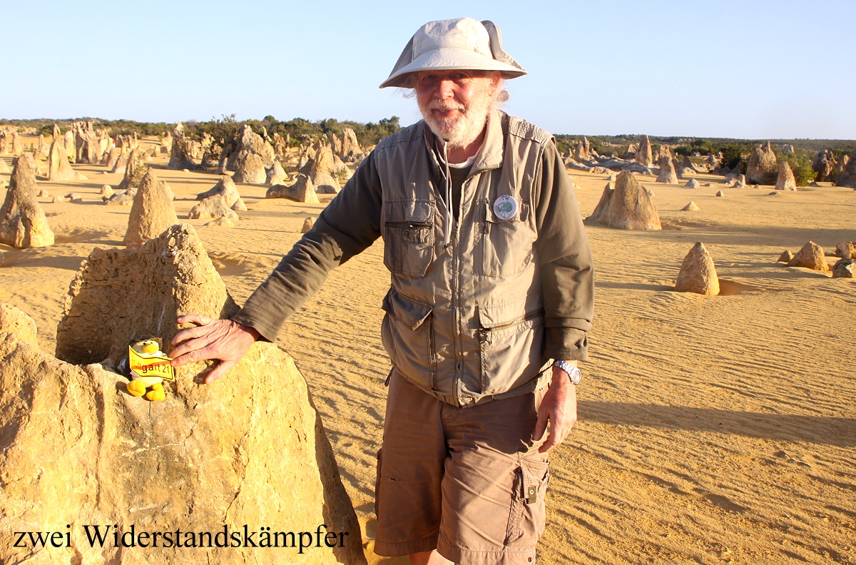 Des öfteren machten wir halt und fotografierten fleißig. An einer Stelle konnten wir mehrere Black-faced Woodswallows beobachten, die immer wieder im Sand nach Futter suchten und sich dann wieder auf die Spitze eines der Obelisken setzten. Der Wind war immer noch sehr, sehr heftig. Wenn wir Entelchen auf einem Stein fotografierten, mussten wir höllisch aufpassen, dass er nicht davon gepustet wurde. |