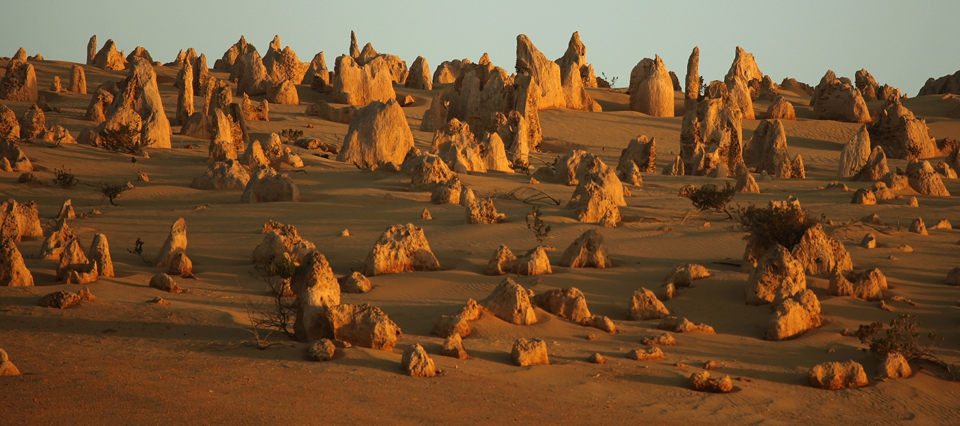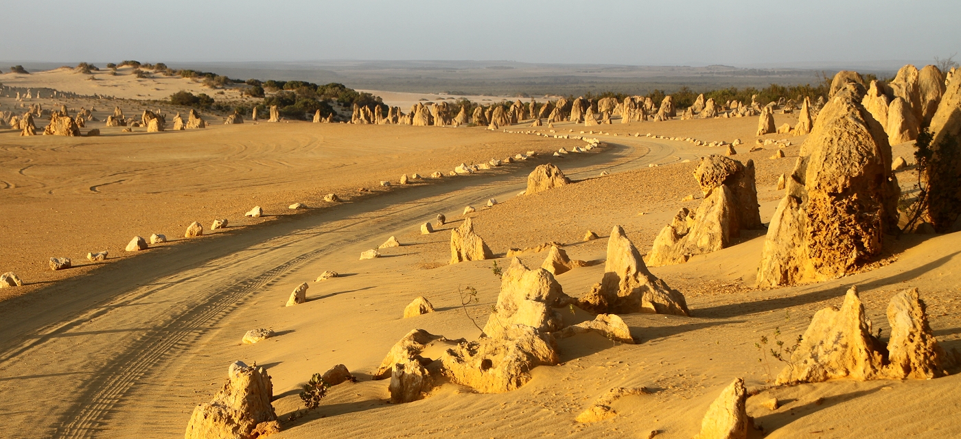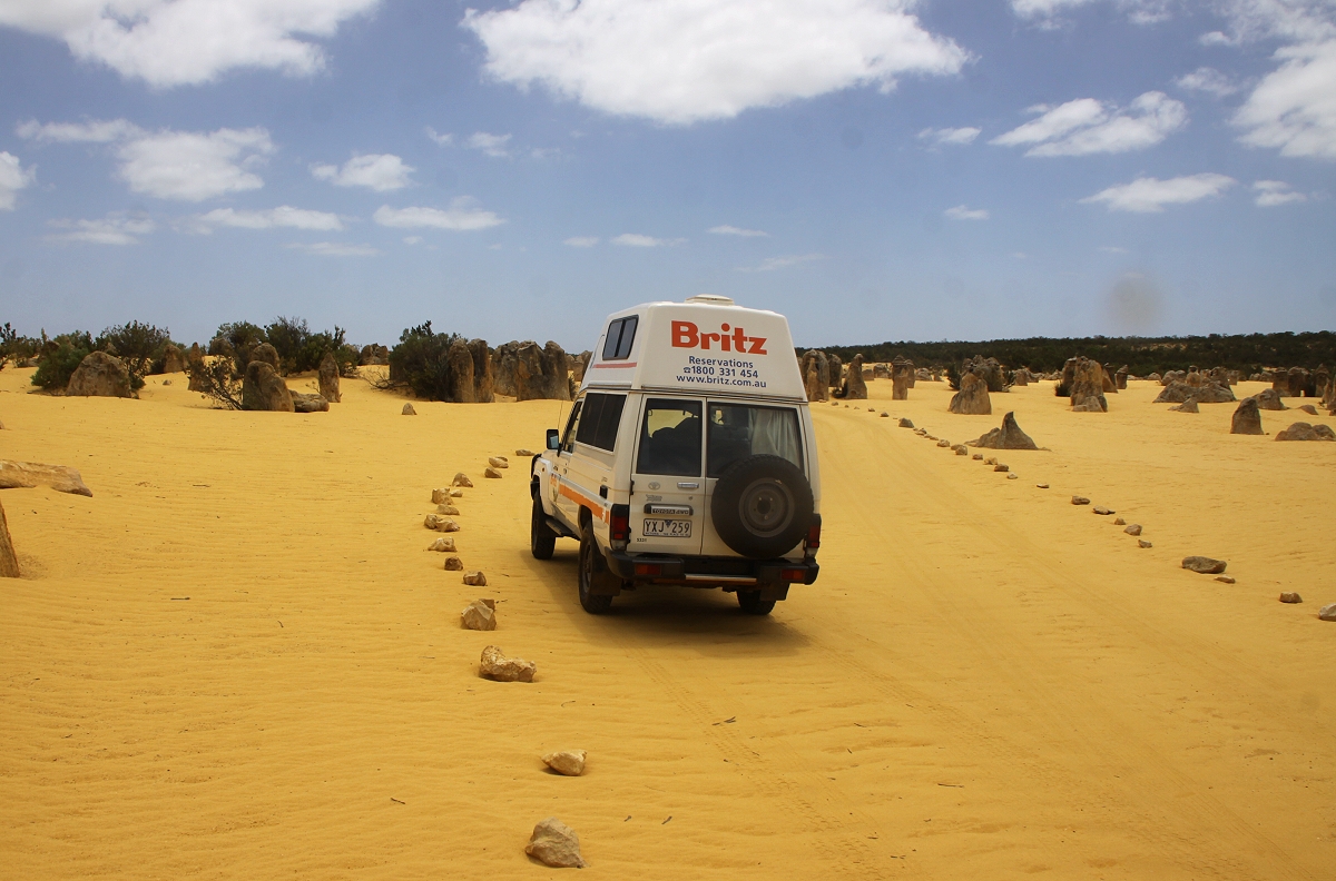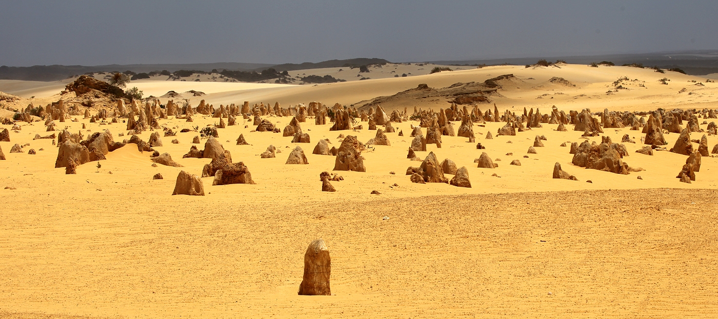 Nach 75 km erreichten wir gegen 11.00 h die Pinnacles. Dies ist ein sandiges wüstenähnliches Gebiet mit zahlreichen Steinen, die wie Obeliske bis zu 3 ½ hoch in dichten Gruppen zusammenstehen. Eine 6 km lange Sandpiste führt durch diese wirklich eigentümliche Landschaft. |