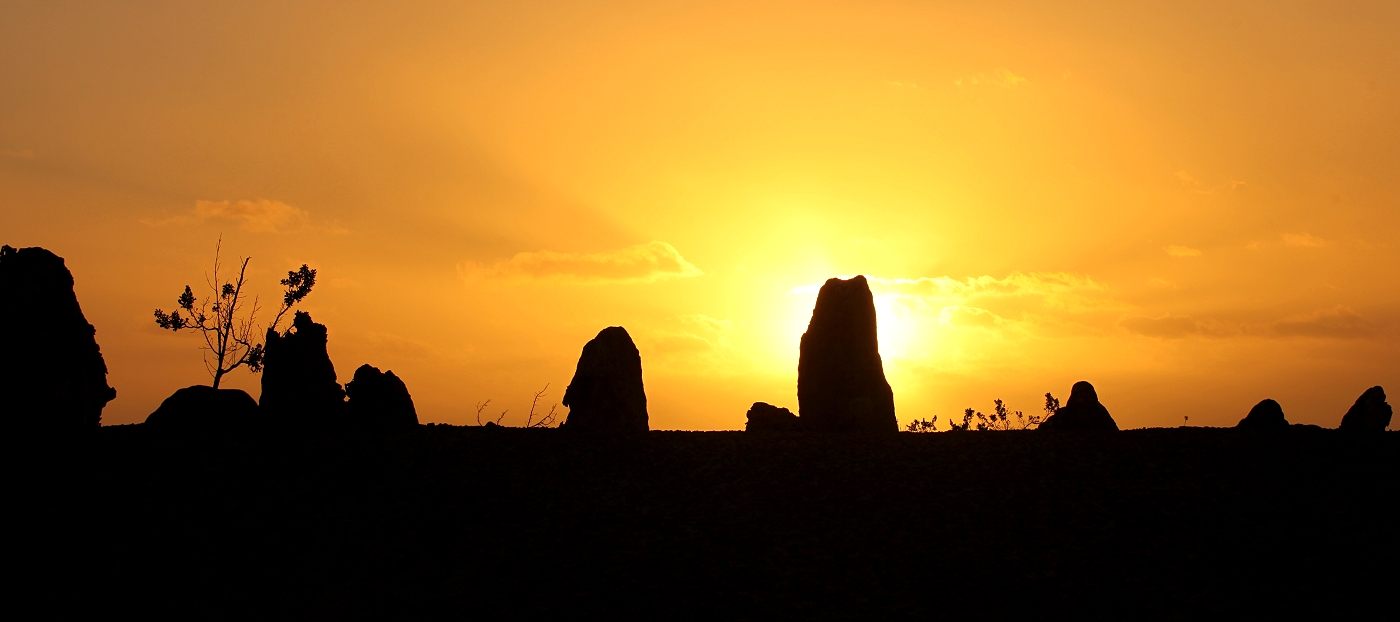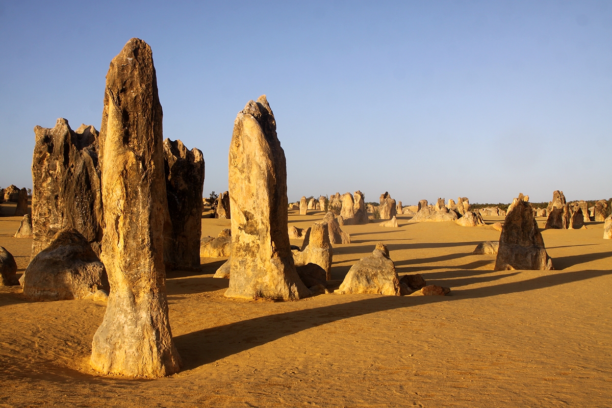 Die Obeliske warfen lange Schatten und auch der wellige Sandboden zeigte in diesem Licht besonders kräftige Kontraste. Langsam machten wir die Runde, immer wieder anhaltend und fleißig Fotos machend. Der stürmische Wind wirbelte die Sandkörner so auf, dass sie an meinen Beinen pieksten. |