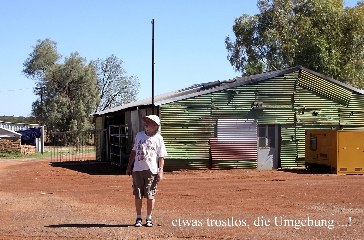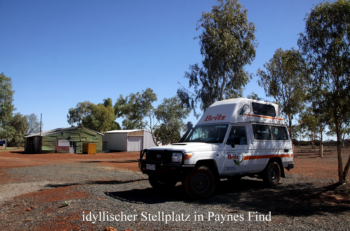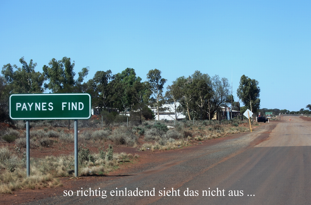 Um 15.15 h erreichten wir endlich Paynes Find, einen Ort der an Trostlosigkeit kaum zu überbieten ist. Der Ort besteht nur aus einer Tankstelle mit angeschlossenem kleinen Restaurant. Der danebenliegende Caravan-Park ist nur ein grobsandiges bis steiniges rotbraunes Areal. |