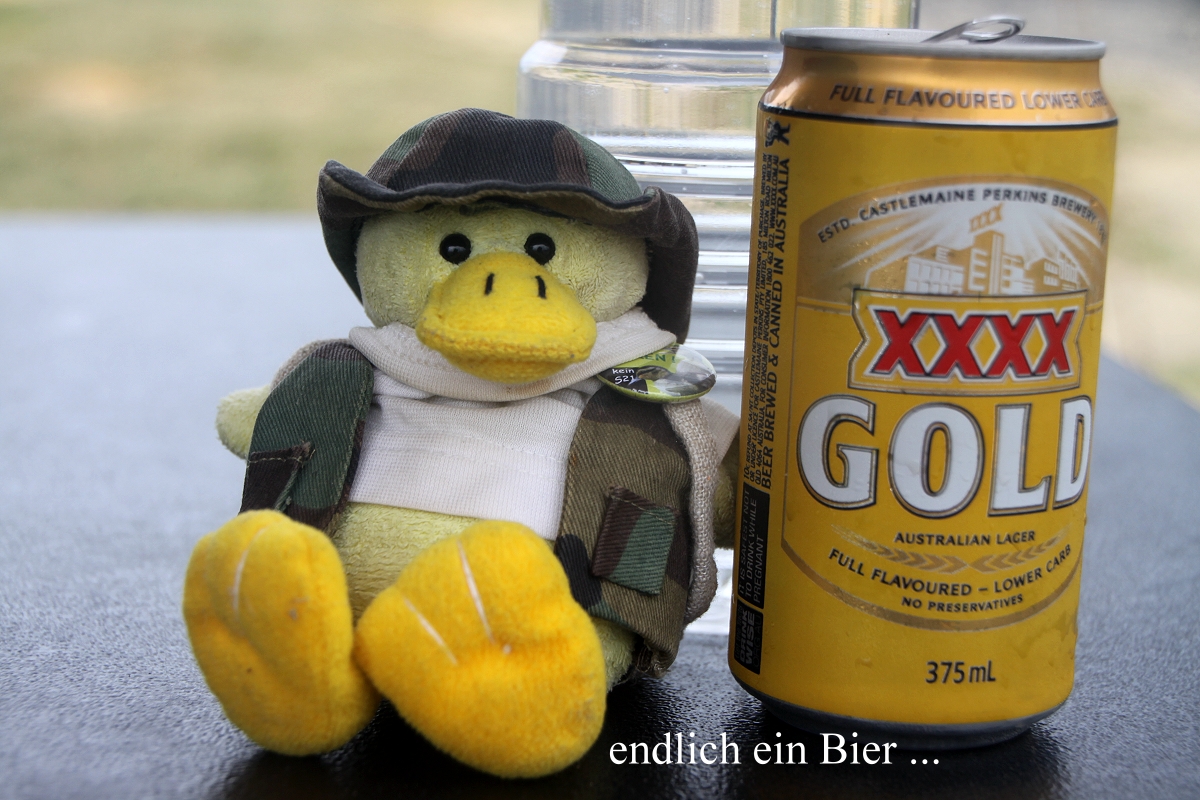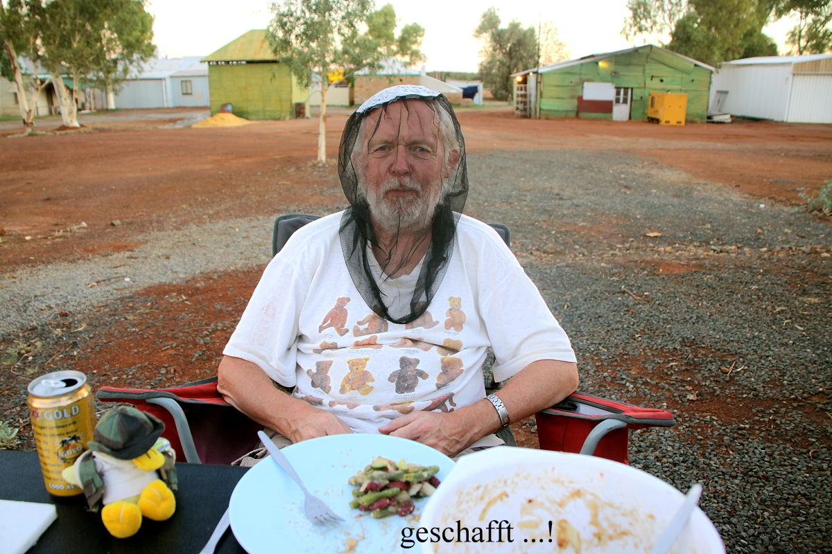 Die Sonne sank langsam tiefer und die Schatten wurden immer länger. Wir fuhren wieder zum Caravan-Park zurück. Tomoko begann gleich mit den Vorbereitungen zum Abendessen. Ich fing derweil schon mal an Tagebuch zu schreiben. Zum Abendessen gab es einen Kartoffel-Bohnen-Salat mit Knoblauch-Toast. Dazu trank ich mit Entelchen noch ein Bier. Das Essen gestaltete sich wegen der Fliegen etwas schwierig. Ich lüftete mein Moskitonetz, schob eine volle Gabel in meinen Mund und zog schnell das Netz wieder herunter. Das klappte ganz gut. Tomoko wurde erstaunlicherweise nicht attackiert. |
