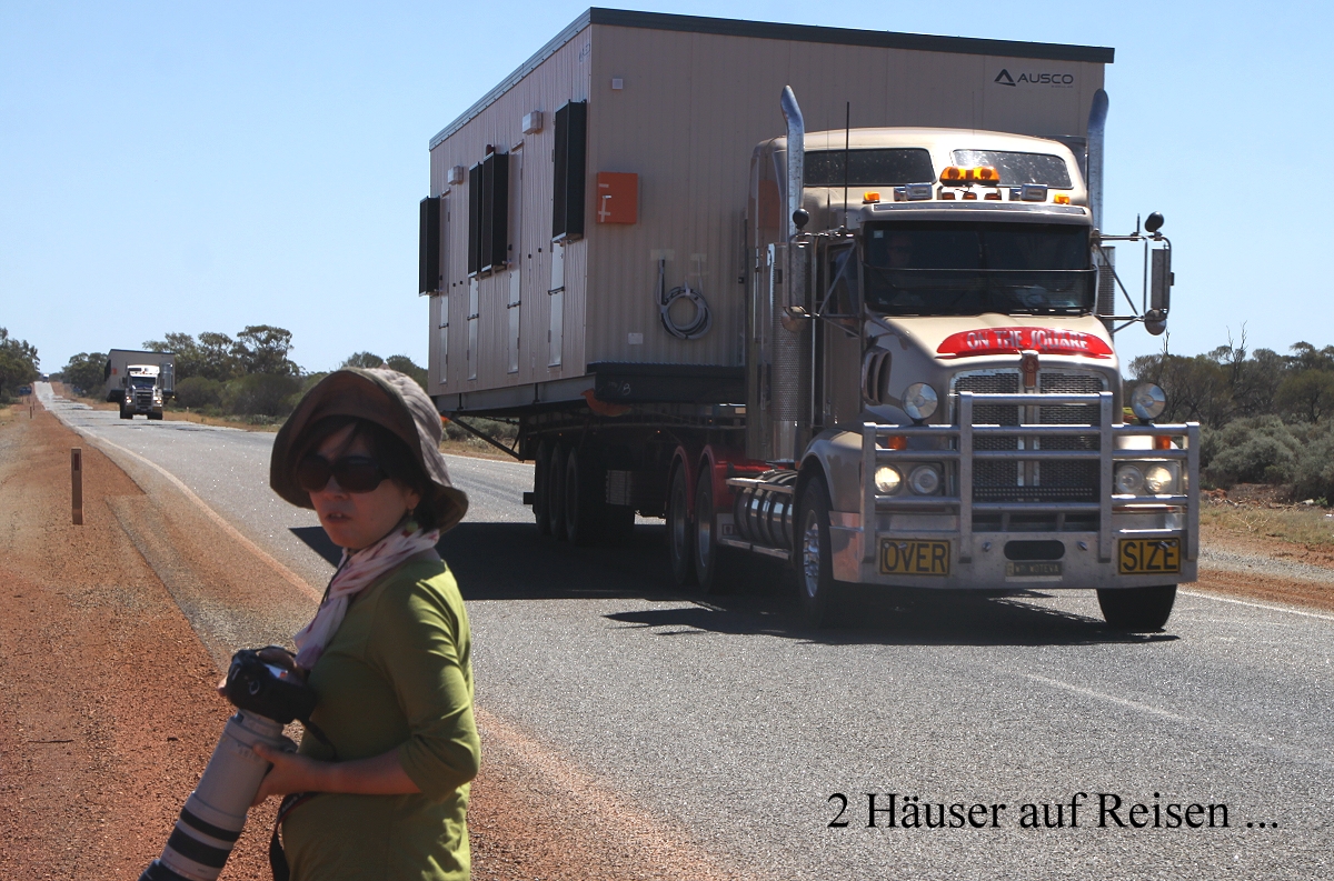 Der Preis war mit 15,- $ allerdings etwas happig. Um 13.15 h fuhren wir weiter. Auf dem großen Highway war mehr Verkehr, besonders die großen bis zu 35 m langen Lastwagen (Road-Trains) kamen uns ziemlich häufig entgegen. Einmal mussten wir selbst ein solches Ungetüm überholen, was wirklich ungewöhnlich lange dauert. Ungefähr 40 km vor Paynes Find waren plötzlich rechts und links der Straße große rotbraune Wasserflächen zu sehen. Hier hatte es wohl vorgestern beim Wetterumschwung starke Regenfälle gegeben. Glücklicherweise war die Fahrbahn aber frei. |