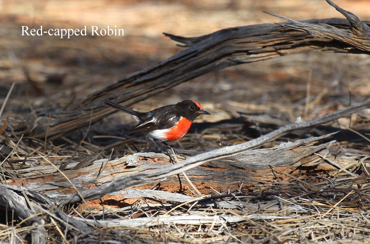 Tomoko machte sich ein Sandwich dazu, da sie natürlich mächtig Hunger hatte. So ruhten wir uns ein wenig aus. Es war inzwischen wieder über 30°. Trotzdem wollten wir noch eine kleine Erkundungsfahrt zu einer der Stellen machen, die uns empfohlen worden waren. Also machten wir uns gegen 16.15 h noch mal auf und fuhren ca. 10 km die Sandstone Road nach Osten. Hier war kein Mensch mehr zu sehen, leider auch sehr wenige Vögel. Erst auf dem Rückweg gegen 18.00 h gab es mehr zu sehen. Zwei Bienenfresser starteten immer wieder von einem Zweig in die Luft und jagten Insekten. Tomoko wagte sich ein wenig in die Büsche. Dort sah sie 2 Mulga Parrots und fotografierte sowohl einen jungen wie auch einen erwachsenen Red-capped Robin. Ich untersuchte inzwischen den feinen roten Sand nach Spuren. Etliche geschlängelte Rillen wiesen auf Schlangen und Echsen hin, die wohl am Abend ihr Versteck verlassen um sich auf dem roten Sand der Straße zu wärmen. Tomoko kam bald zurück. Auch sie fürchtete in dem Gelände auf Schlangen zu stoßen. Gemeinsam sahen wir dann noch einen farbenprächtigen Yellow-throated Miner. |