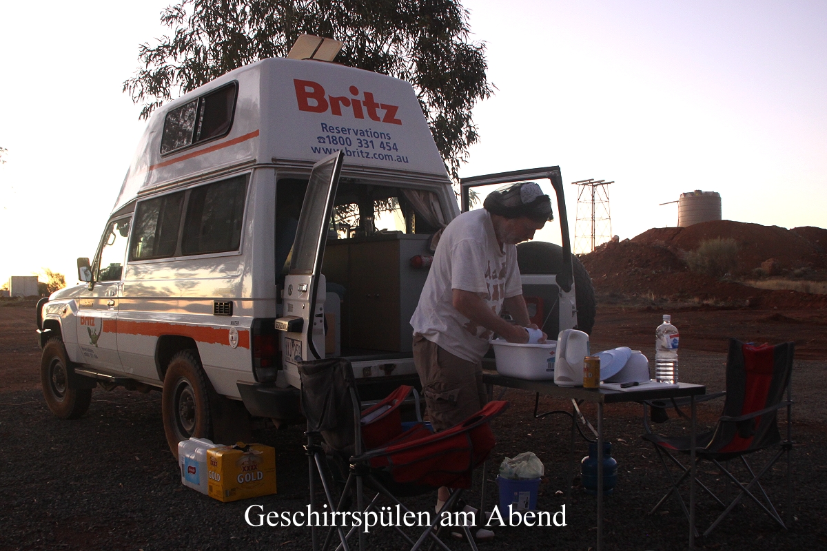 Da es keine Spülmöglichkeit auf dem Caravan-Park gab, machten wir Wasser mit Hilfe des Gasherds heiß (Tomoko hatte leider den Wasserkocher vorhin beim Kochen mit viel zu wenig Wasser gefüllt, so dass sich dieser überhitzte und mit einem Kurzschluss verabschiedete). |