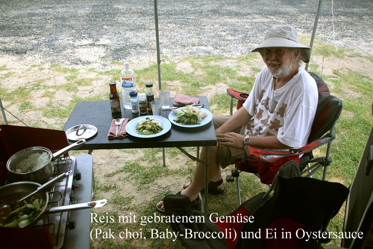Dann nahm ich erst mal Platz und öffnete sehr zur Freude von Entelchen ein kühles Bier, prost !!! Während ich danach Tagebuch schrieb, kochte Tomoko ein sehr leckeres Abendessen (Reis mit gebratenem Gemüse (Pak choi, Baby-Broccoli) und Ei in Oystersauce). |