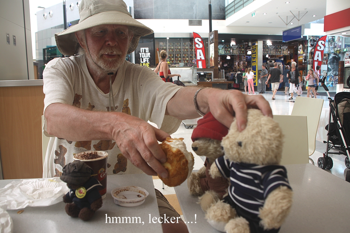Also fuhren wir los Richtung Perth, das wir gegen 13.00 h erreichten. Unser Navigationsgerät fand zwar die richtige Straße, jedoch bei der gezeigten Ankunft war weit und breit keine Toyota-Niederlassung zu sehen. Also fuhren wir einfach die Straße weiter entlang bis wir schließlich den richtigen Ort fanden. Der Mitarbeiter beim Service-Schalter erkannte gleich das im Auto angezeigte Problem. Der Kraftstofffilter muss ausgetauscht werden. Das ganze würde ca. 1 Stunde Arbeitszeit in Anspruch nehmen, derzeit wäre aber alles ausgebucht und wir müssten bis Montag warten, also noch 5 Tage !!! Das wollten wir natürlich nicht. Also fuhren wir zu Britz. Dort war man sehr hilfsbereit. Wir sollten Platz nehmen, das ganze würde nur 10 Minuten dauern, dann könnten wir weiterfahren. Ungläubig schauten wir uns an, aber tatsächlich wurde das Auto nach 10 Minuten vorgefahren und das Problem war behoben. Wer hätte das gedacht, wir hatten insgeheim schon damit gerechnet, ein anderes Auto übernehmen zu müssen. Hocherfreut verabschiedeten wir uns. Es gab hier noch ein Regal, wo andere Kunden am Ende ihrer Reise überzählige Sachen zurückließen, die man sich kostenlos nehmen konnte. Ich nahm mir eine Flasche Sonnenöl, Tomoko Einwickelpapier und verschließbare Plastiktüten. Außerdem erhielten wir noch ein Set mit Schneidebrett, Küchentüchern und Raspelbrett, die bei der Übergabe des Autos vorgestern gefehlt hatten. Nun machten wir uns wieder auf den Rückweg. In Jondaloop machten wir halt. Tomoko kaufte ein Gemüse-Sushi-Set. In der Food-Mall nahmen wir Platz. Tomoko aß ihr Sushi, ich ein süßes Gebäckstück, das Tomoko heute Morgen in einer Bäckerei in Lancelin gekauft hatte. Dazu tranken wir einen Cappuccino, der wieder munter machte. |