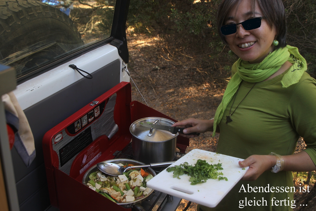 Also gingen wir gegen 17.00 h wieder zurück und Tomoko fing an zu kochen. Heute gab es Tortellini in Champignon-Thymian-Sauce, dazu einen Ruccola-Avocado-Salat mit Joghurt-Dressing, sehr schmackhaft. Dazu öffneten wir eine Flasche Cabernet Sauvignon aus der Gegend. |