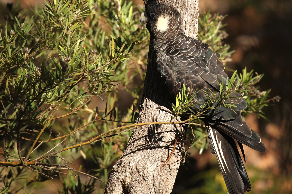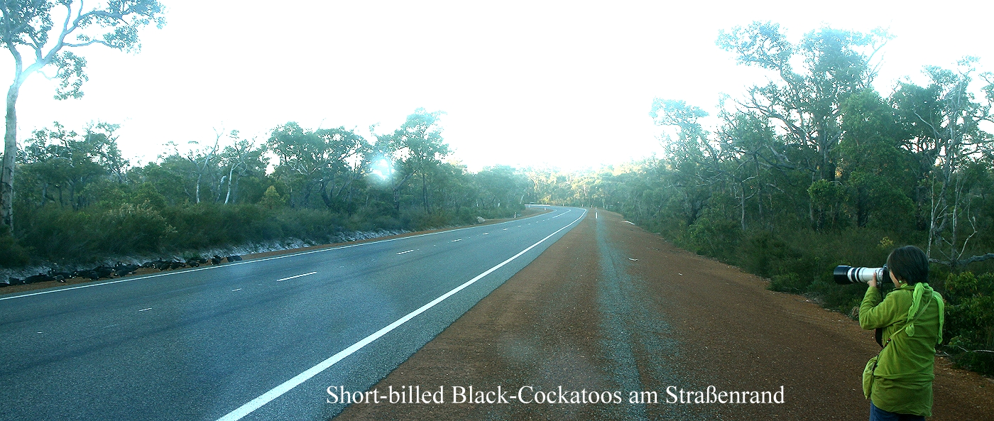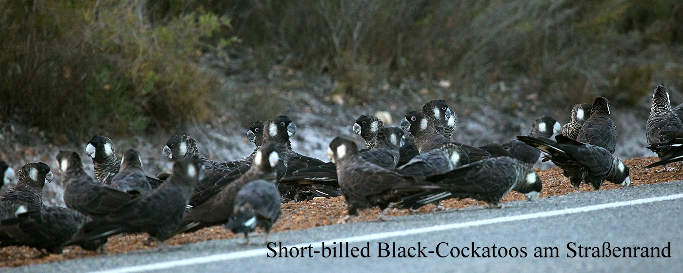 Im Licht der jetzt sehr tief stehenden Sonne fuhren wir langsam zu unserem Campingplatz zurück. Nochmals sahen wir am Straßenrand eine Gruppe schwarzer Short-billed Black-Cockatoos, die aber beim Näherkommen auf etwas entferntere Bäume flüchteten. |