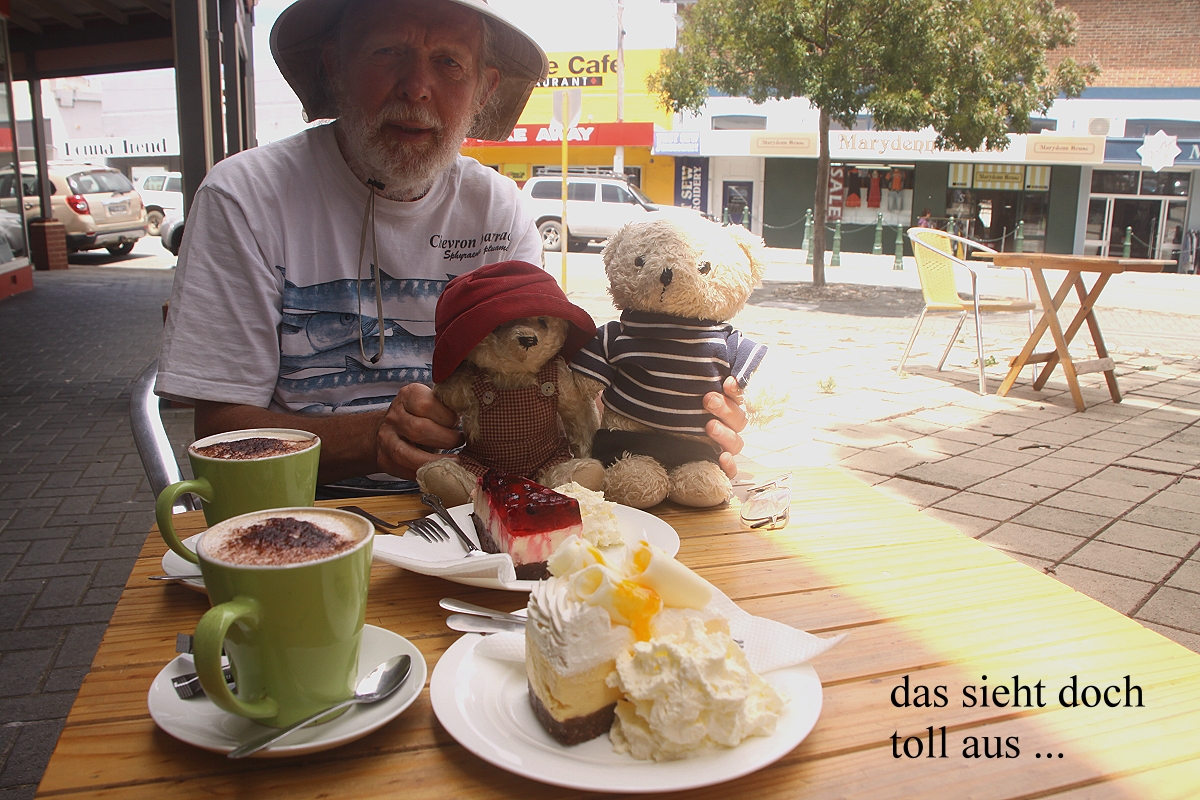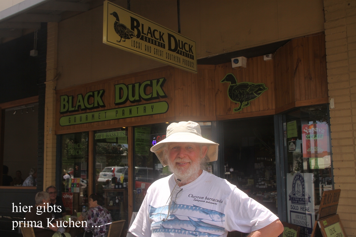 Wir blieben bis ungefähr 9.30 h, als es zusehends ruhiger wurde. Dann machten wir uns auf die verbleibenden 80 km nach Albany, das wir nach einer guten Stunde erreichten. Auf dem Weg dorthin entdeckten wir in einiger Entfernung auf einer Wiese eine große Gruppe Straw-necked Ibis, die dort nach Futter suchten. Gleich am Anfang von Albany hielten wir an einer großen Shopping-mall. Tomoko ging in den Lebensmittelmarkt "Woolworths" um unsere knapp gewordenen Lebensmittel zu ergänzen. Ich kaufte mir unterdessen eine Tageszeitung und setzte mich gemütlich in eine Polstergruppe. Als Tomoko mit ihren Einkäufen fertig war, kauften wir im nahen Liquor Store noch eine Flasche Cabernet Sauvignon und ein Six-Pack Bier. Nachdem wir alles im Auto verstaut hatten, fuhren wir in die Innenstadt. Dort parkten wir das Auto in der Nähe des Meeres und gingen die Hauptstraße wieder hinauf auf der Suche nach einem Café. Nach ein paar hundert Metern fanden wir eins. Es hieß "Black Duck" und in seiner Vitrine lagen sehr leckere Kuchen. Wir suchten uns jeder einen unterschiedlichen Cheese-Cake aus. Dazu tranken wir je einen Cappuccino. Das ganze war mit 16,- $ gar nicht mal so teuer. |