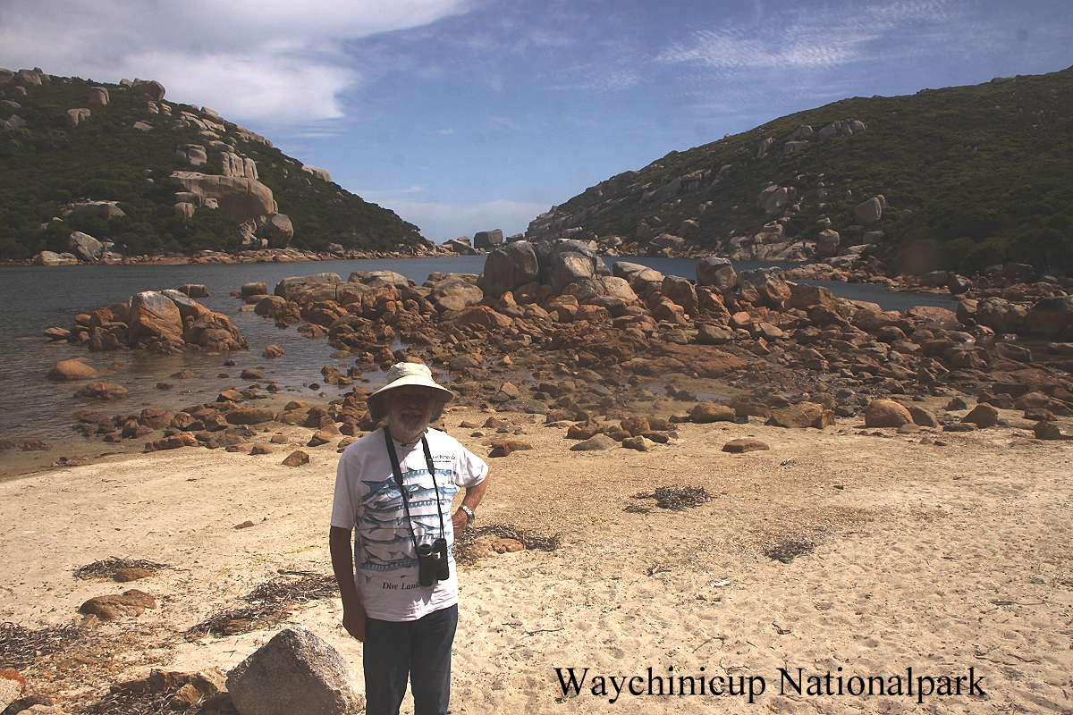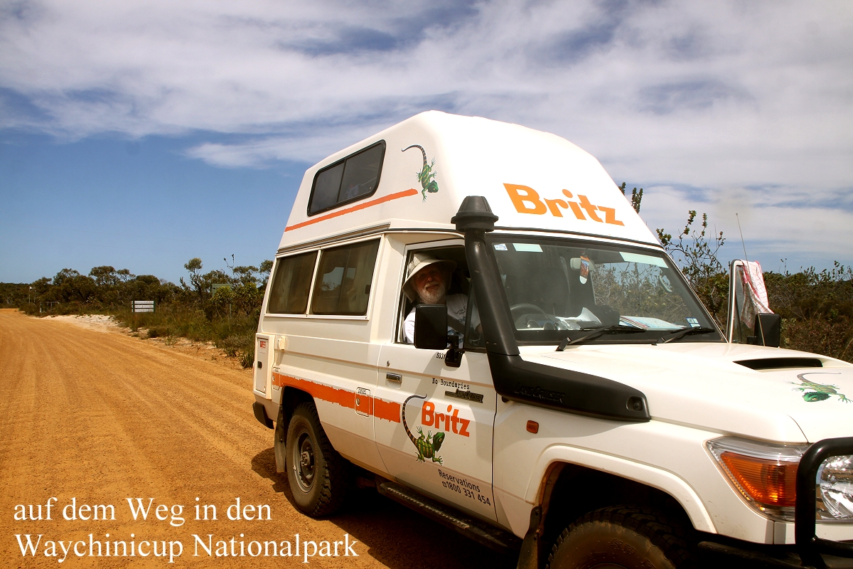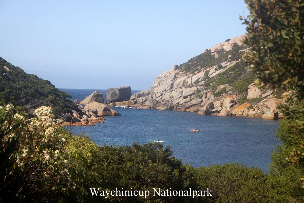 Wir gingen wieder zurück zum Auto und machten uns auf den Weg zum Waychinicup Nationalpark, der etwa 60 km weiter im Osten von Albany liegt. Die letzten 6 km führten über eine sehr enge und holprige Strecke. Am Ziel angekommen suchten wir zunächst nach einem passenden Platz zum Übernachten. Der Campingplatz in dichtem Gebüsch (Heath) gelegen, hat nur wenige Stellplätze. Alle waren belegt bis auf einen, den wir schnell besetzten. Wir machten einen kleinen Spaziergang einen engen Pfad zum Meer hinunter. Die Aussicht auf eine Bucht, eingerahmt von mächtigen runden Felsen mit einer engen Verbindung zum Meer, war beeindruckend. |