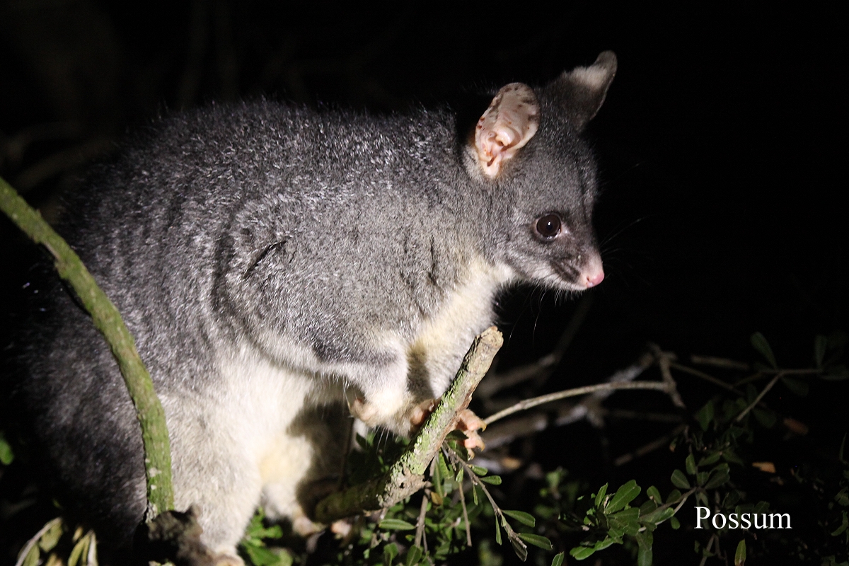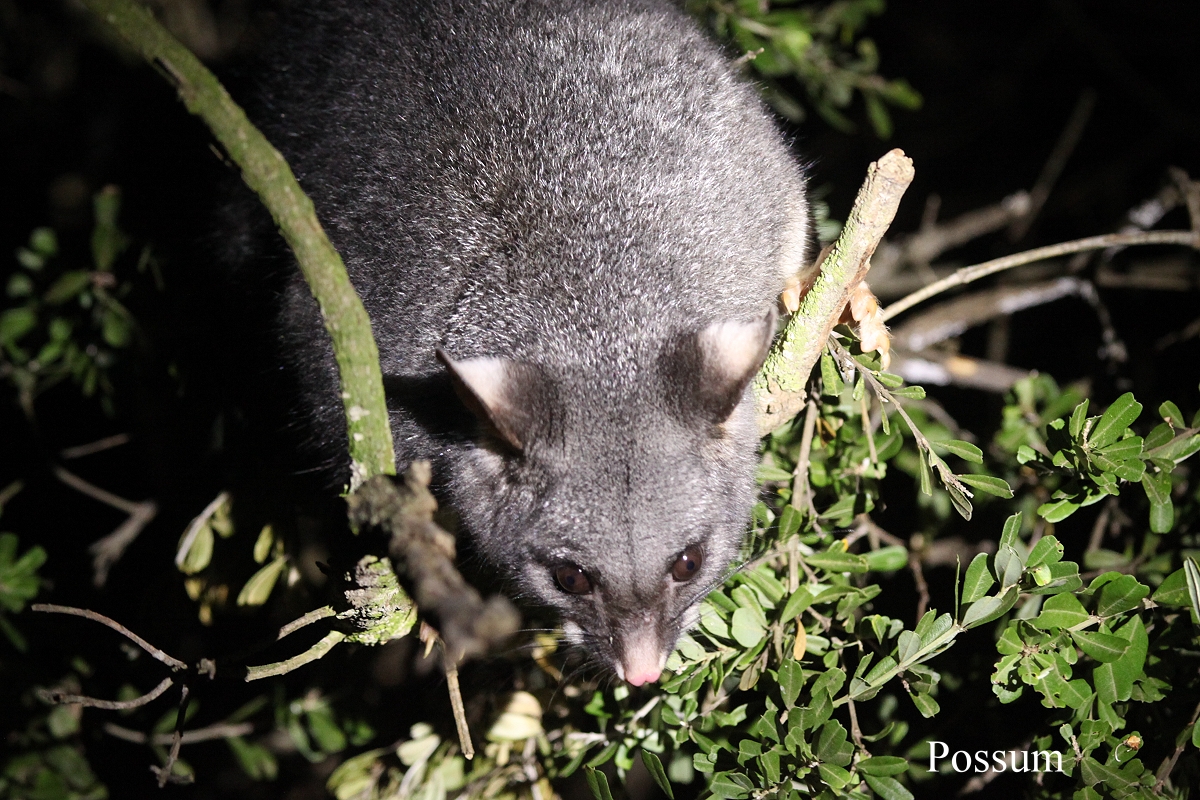 Plötzlich hörten wir ganz nah den Ruf des Noisy Scrub-Birds, den wir vorhin studiert hatten, der tatsächlich dem Ruf einer Nachtigall ähnelt. Der Ruf war so laut, dass es fast in den Ohren schmerzte. Wir waren höchstens 2 m entfernt. Ich suchte fast eine Stunde mit dem Fernglas intensiv das dichte Buschwerk ab, doch so sehr wir uns beide auch bemühten, den Vogel bekamen wir nicht zu Gesicht. Nur Tomoko sah mal ganz kurz einen Schatten und kurze Zeit später den Vogel schnell fliegend den Weg überqueren. Gegen 19.30 h, es wurde langsam dunkel, brachen wir die Suche ab und gingen zum Auto zurück. Tomoko spülte noch das schmutzige Geschirr, dann schauten wir gemeinsam unsere Fotos von heute an, die teilweise wirklich toll waren. Ich schrieb noch mein Tagebuch fertig. Da wir heute Morgen schon so früh aufgestanden waren, wurden wir ziemlich früh müde. Irgendetwas stank miserabel in unserem Auto. Tomoko identifizierte unseren alten Spülschwamm als den Übeltäter. Ich öffnete noch mal die Autotür um den Schwamm nach draußen zu befördern. Im Augenwinkel sah ich, wie unsere an einem Ast aufgehängte Plastikmülltüte etwa einen Meter tiefer hing und sich bewegte. Ich konnte im Dunkeln nichts erkennen. Als ich näher trat, erschreckte ich, denn irgendein Tier bewegte sich auf dem Ast. Schnell rief ich Tomoko, die mit einer Taschenlampe kam. Da saß doch tatsächlich ein Possum in den Zweigen und versuchte die Mülltüte zu erreichen. Tomoko holte die Kamera und im Scheine der Taschenlampe konnten wir ein paar schöne Fotos von dem possierlichen Tierchen machen, das keine Anstalten machte sich zu entfernen. |