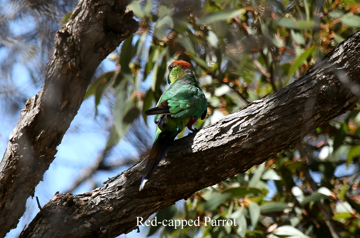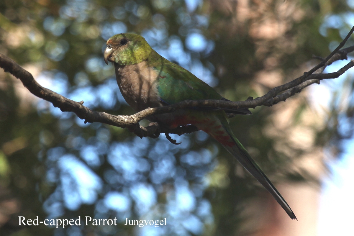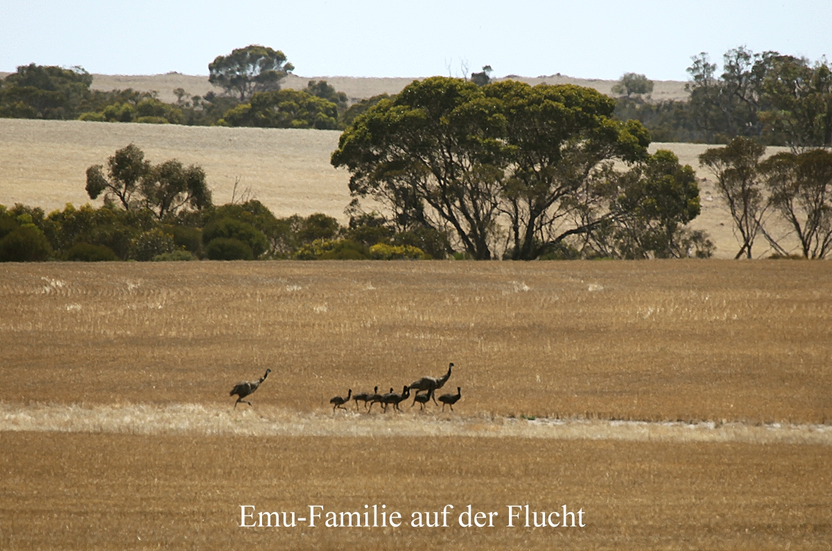 Gegen 10.00 h erreichten wir die Red-Gum-Pass-Road, das westliche Ende des Nationalparks. Von hier führte eine Straße (Salt River Road), die teilweise asphaltiert ist, wieder zurück. Mehrfach sahen wir in den abgeernteten Weizenfeldern Gruppen von Emus durch die Landschaft laufen. Einmal waren es mehr als 30 Exemplare, ein andermal eine Emu-Familie, 2 Eltern mit mehreren Jungen. Auch zwei Red-capped Parrots zeigten sich kurz in einem Baum. Für ein Belegfoto reichte die Zeit noch, bevor sie wieder im Gebüsch verschwanden. |