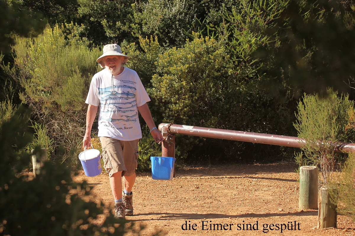 Der Tag war gerettet. Wir gingen zum Auto zurück und machten es uns in unseren Sesseln gemütlich. Ich las ein wenig. Gegen 10.00 h hatte Tomoko schon Hunger und packte die Reste von gestern Abend aus. Obwohl noch so früh am Tag, schmeckte ihr das "Mittagessen", zusätzlich mit einem Bier, vorzüglich. Das Bier gefiel natürlich auch Entelchen sehr. Bei mir meldete sich der Hunger erst gegen 11.00 h, als ich den Rest verzehrte. Danach zog ich meine Badehose an und ging ein wenig schwimmen. Die Wasseroberfläche in der Bucht war ruhig und spiegelglatt wie in einem See. Ich planschte ein wenig im glasklaren Wasser umher und setzte mich anschließend in die Sonne. Die brannte aber inzwischen so stark vom wolkenlosen Himmel, dass ich nach einer halben Stunde wieder zurückging. Bei der Gelegenheit hatte ich unsere Mülleimer mal gründlich im Wasser ausgespült. Ich las im Schatten der Sträucher meinen Spiegel weiter. Irgendwann bekamen wir Lust auf Kaffee und Kuchen. Tomoko hatte gestern sehr leckere Kuchenstücke gekauft, die wir uns jetzt bei einem Kaffee schmecken ließen. Auch unsere Bären waren begeistert. |