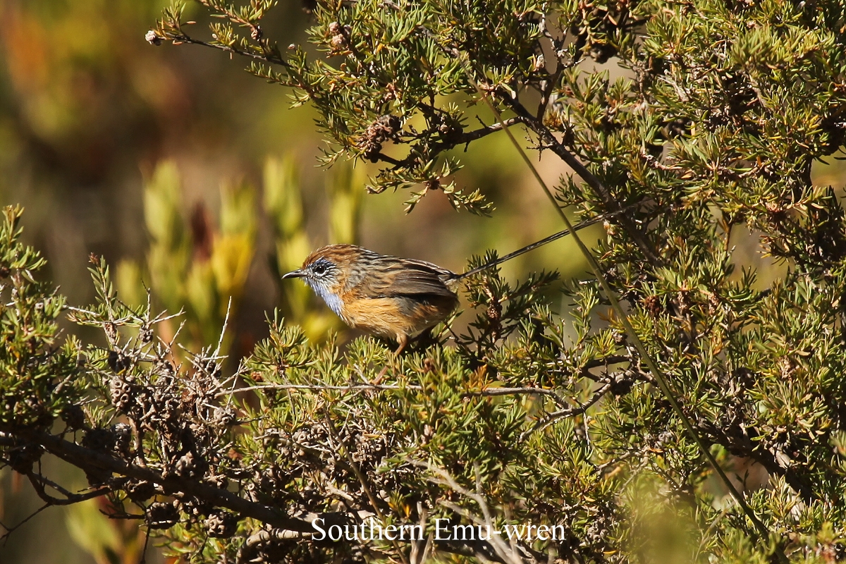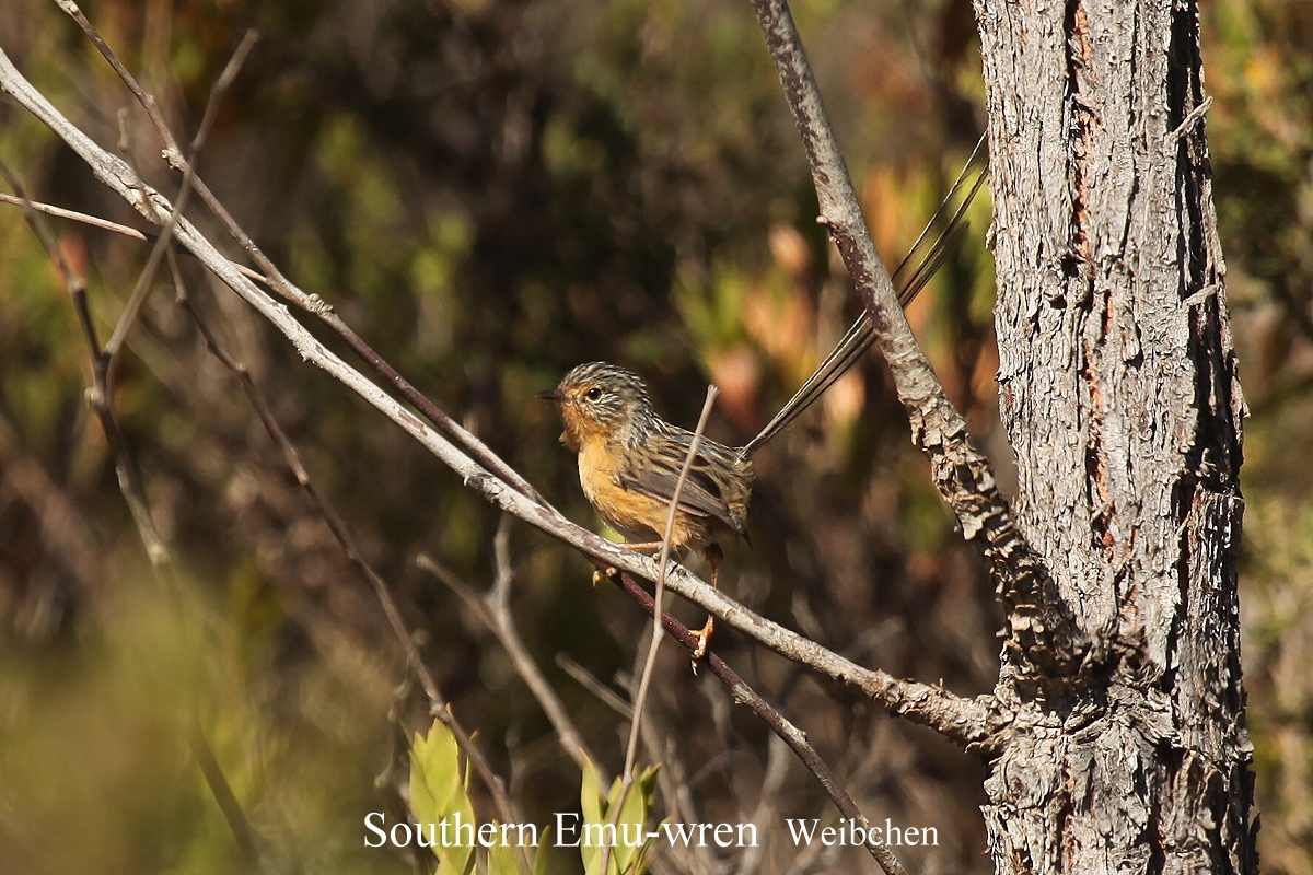 Als ich am Auto ankam, war Tomoko nicht da. Ich vermutete, dass sie wieder den Weg von heute morgen hochgegangen war und ging in diese Richtung. Nach kurzer Zeit kam sie mir überglücklich entgegen. Es war ihr gelungen, den schon lange von ihr gesuchten Southern Emu-wren zu finden, und zwar sowohl ein Männchen als auch ein Weibchen. Begeistert zeigte sie mir die gemachten Fotos. |