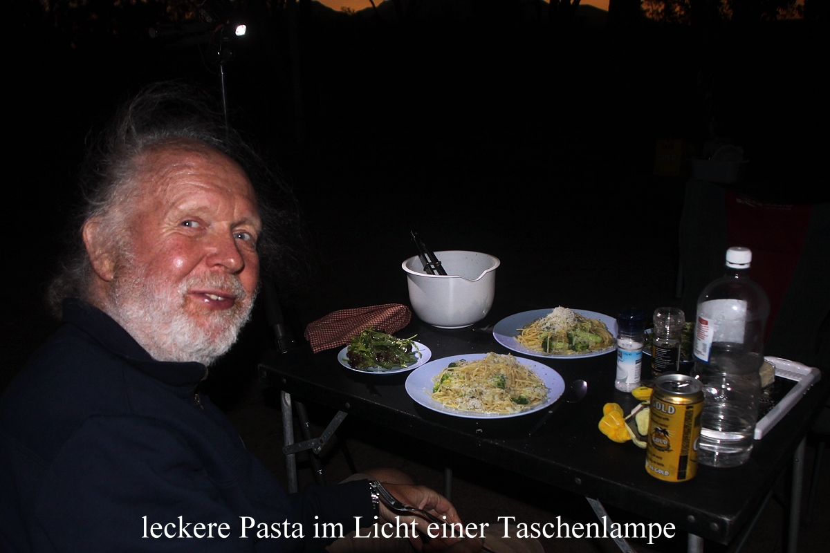 Da aber zunächst nichts weiteres passierte, packten wir unsere Campingmöbel aus und bereiteten uns erstmal ein Frühstück. Auch zwei Kängurus hoppelten durch die Büsche. |