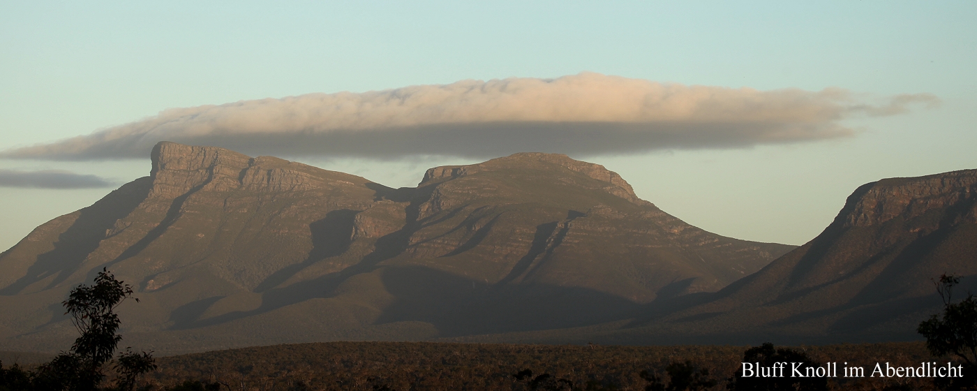 Nach ca. 10 km erreichten wir die Abzweigung zur Stirling Range Road, die auf einer Länge von 42 km den gesamten Nationalpark von Osten nach Westen durchquert. Am frühen Morgen fährt man diese unbefestigte Schotterstraße am besten in der Richtung, wie wir es taten, so dass man die noch tiefstehende Sonne im Rücken hat. Die Piste führt durch ziemlich hügeliges einsames Gelände. Kein Auto begegnete uns und weit und breit war kein Mensch zu sehen. Leider galt das auch für die Tierwelt. Außer einem Waran, der sich schnell in die Büsche davonmachte, war kein Tier zu sehen. |
