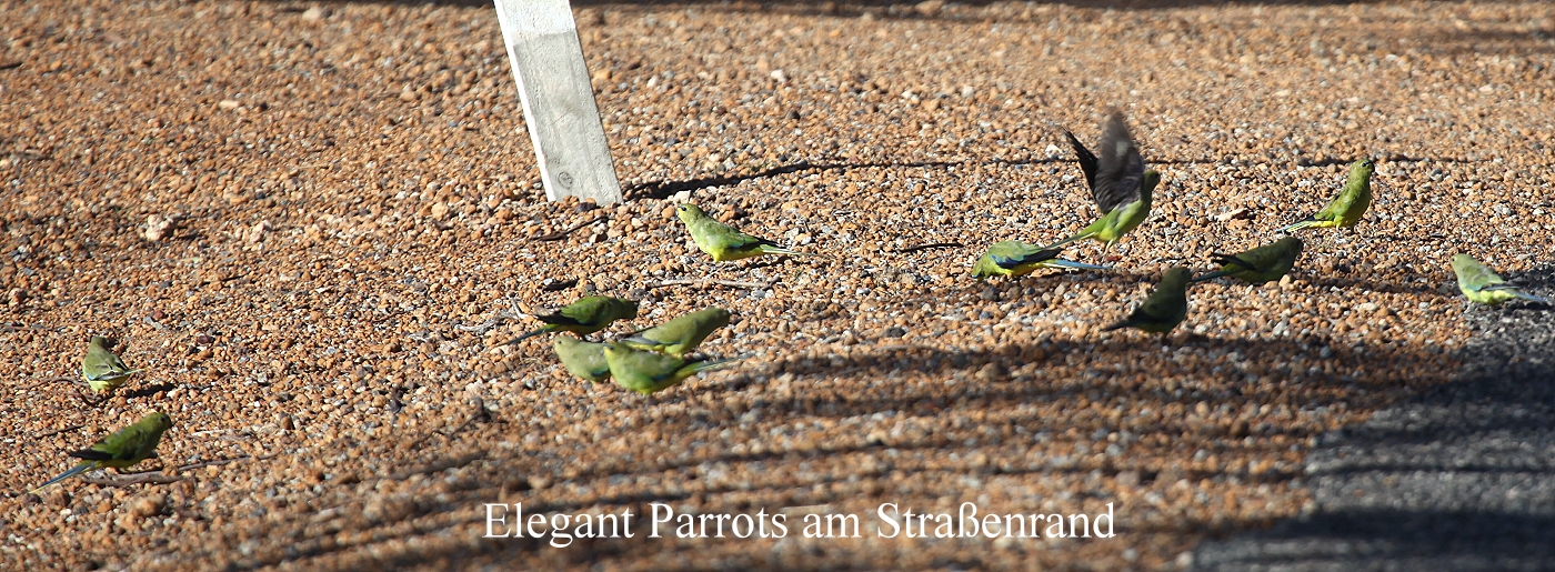 Es war zwar sonnig, aber wieder ziemlich kühl, nur 16° im Auto, und da auch der Wind wieder aufgefrischt hatte, zog ich zunächst mal meine warme Jacke an. Das Frühstück in der frischen Luft schmeckte lecker wie immer. Wir wollten heute eine Rundfahrt durch den Stirling Range Nationalpark machen, deshalb machten wir uns schnell fertig. Gegen 7.30 h starteten wir. Gleich am Ausgang des Campingplatzes saßen mindestens 20 Elegant Parrots auf der Straße und pickten irgendwelche Samenkörner, die der Wind auf die Straße geweht hatte. Wie wir später von einem Ranger erfuhren, stammen die Körner von vorbeifahrenden Lastwagen, die Weizen transportieren. Im Fahrtwind gehen dann viele Körner verloren, sehr zur Freude der Körner fressenden Vögel. Eine Taube (Common Bronzewing) flüchtete in die Büsche, wo auch wenig später zwei Elegant Parrots ruhig in einem Baum saßen. Zwei Adler (Wedge-tailed Eagle) schraubten sich im frischen Wind höher und höher. |