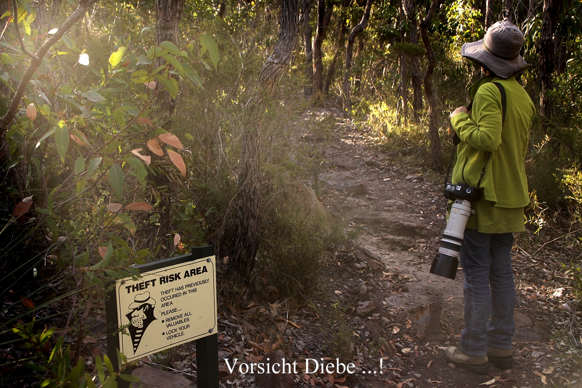 Um 5.00 h standen wir im Licht des anbrechenden Tages auf. Die aufgehende Sonne war noch hinter den Bergen versteckt. Tomoko nahm ihre Kamera in die Hand und ging schon mal langsam den Weg hinauf. Ich folgte wenige Minuten später. Beim Weggehen hörte ich mehrmals den Ruf des Western Whipbird aus der Ferne. Es war aber sonst nicht allzu viel los. In der Ferne konnten wir einige White-tailed Black-Cockatoos sehen. Ob es "short-billed" oder "long-billed" waren, konnten wir auf die Entfernung aber nicht erkennen. |