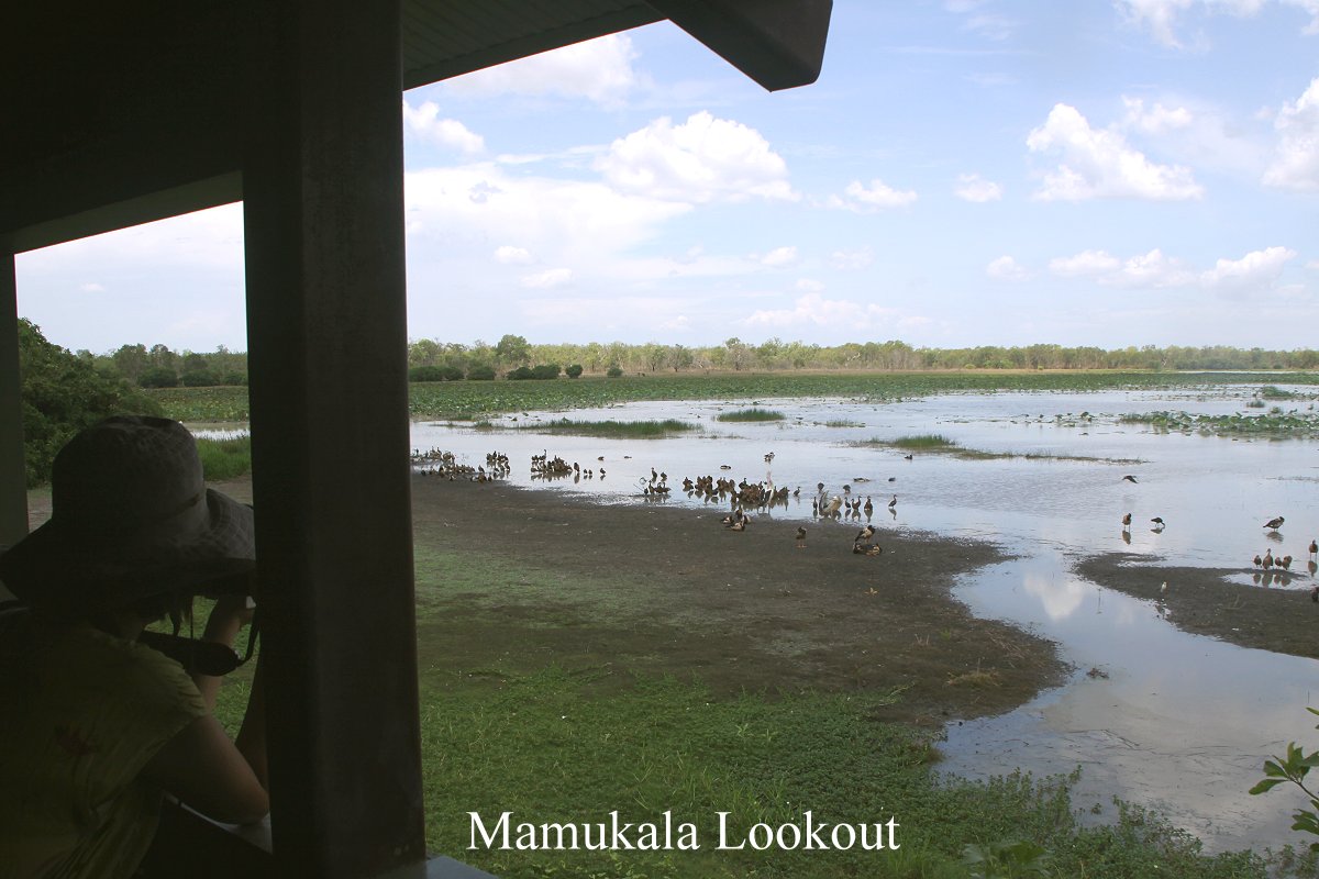 Einige km weiter tauchten nochmals 2 Red-tailed Black-Cockatoos auf einem Baum direkt neben der Straße auf, die wir deutlich besser beobachten konnten. Kurz darauf erreichten wir die Grenze zum Kakadu NP. Am Aurora Kakadu Hotel hielten wir kurz und kauften zwei Eintrittspässe für den Park, je 25,- $, gültig für 14 Tage. Da ich etwas müde war von der Hitze, kaufte ich mir einen Cappuccino an einer Kaffeemaschine für 3,50 $, der aber nicht besonders gut schmeckte. Weiter ging es bis auf einmal ein Schild vor einer Abzweigung zum Mamukala Lookout auftauchte. Tomoko fühlte sich fit, so dass wir den 1 km langen Abstecher machten. Was uns erwartete war unbeschreiblich. Auf dem 100 m langen Weg vom Parkplatz hörten wir schon ein unbeschreibliches Konzert von verschiedenen Vogelstimmen, das uns die Hitze vergessen ließ. Am Hide angekommen waren wir sprachlos. Tausende von Wasservögel bevölkerten die von blühenden Lotusblumen bewachsene vor uns liegende endlose Fläche. |