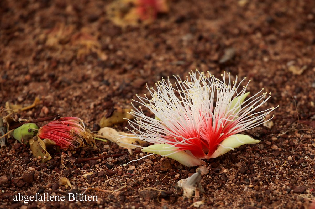 Der Rundweg führte dicht an überhängenden Felsen vorbei, hoch zu einem Aussichtspunkt mit Blick auf den Nourlangie Rock und auf der anderen Seite wieder hinab. An einer Stelle hatten Touristen aus Samenkörnern eine kleines natürliches "Kunstwerk" geschaffen. |