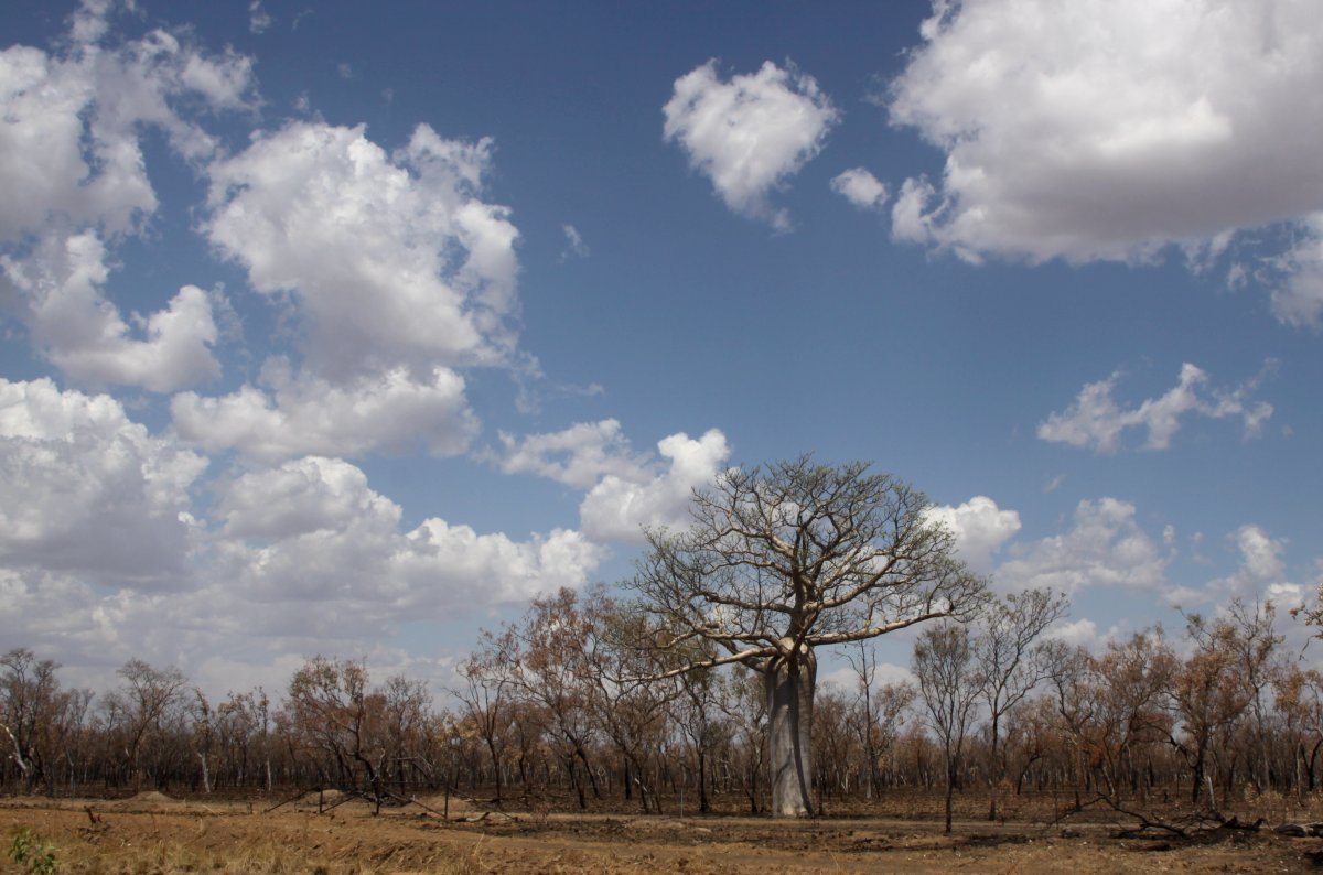 Wir kamen gut voran, da kaum Verkehr auf der Strecke herrschte. Um 12.15 h erreichten wir den Victoria River. Am dortigen Roadhouse machten wir im Schatten eines Baumes eine kleine Pause (30 min). Um 13.40 h bei Timber Creek fielen mir vor Müdigkeit fast die Augen zu und wir hielten für 15 min am Straßenrand. Bis zur Grenze nach Westaustralien liegen noch 180 km vor uns. Das sollte in 2 Stunden bis 16.00 h zu schaffen sein. Dort muss die Uhr um 1 ½ Stunden zurückgestellt werden, so dass wir Zeit gewinnen. Die Landschaft änderte sich allmählich. Immer mehr tauchten jetzt die hier typischen Boab-Trees auf, Bäume mit eigenartigen flaschenförmigen Stämmen, zum Teil sehr dick. |