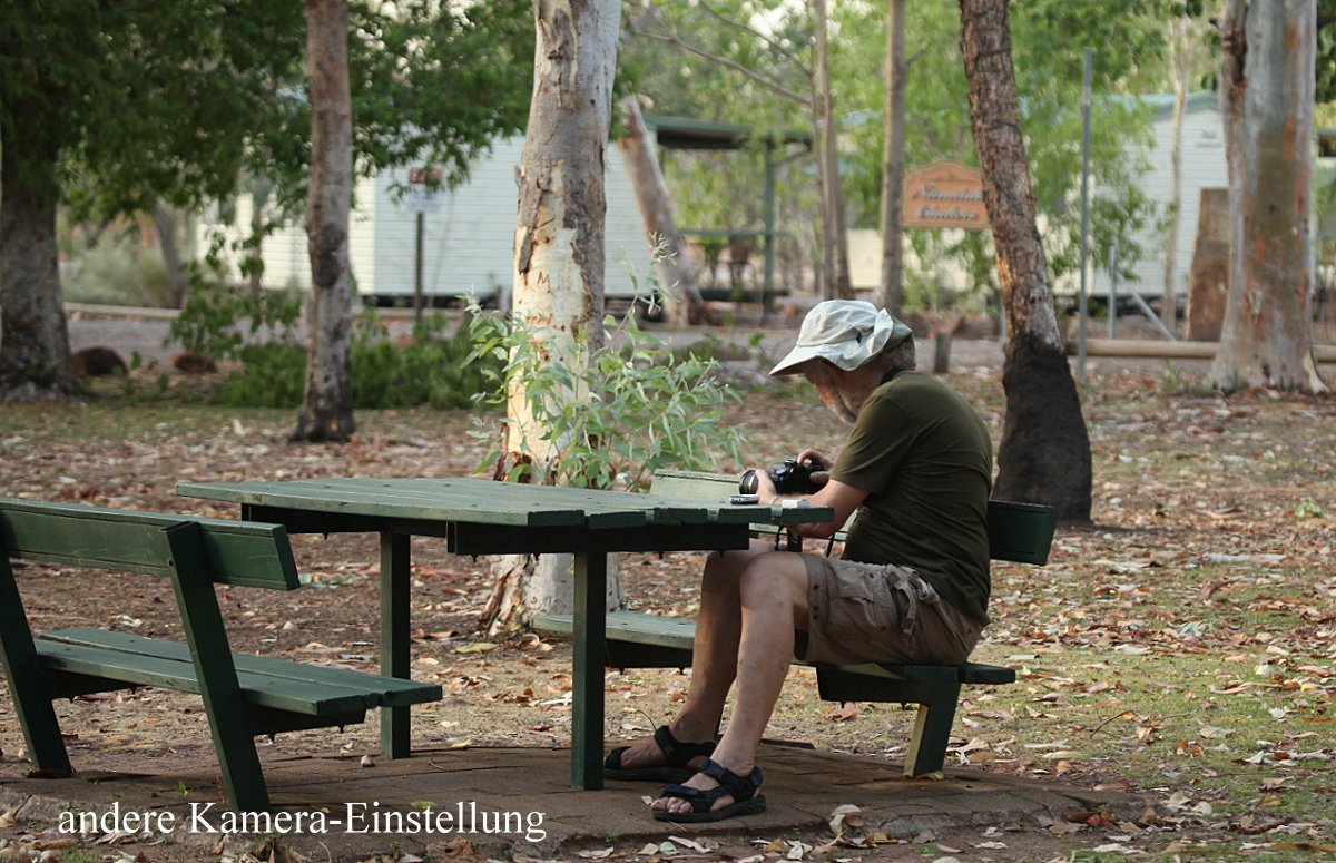 Um 6.15 h wachten wir auf. Es war zwar schon 26° warm, aber im Verhältnis zu gestern Abend angenehm. Viele Vögel waren schon unterwegs, aber auch die lästigen kleinen Fliegen, die es immer nur auf Augen, Mund und Nase abgesehen haben. Während Tomoko eine Runde auf dem Campingplatz machte, ging ich über einen kleinen Fußweg hinunter zum Fluss Katherine River (ca. 800 m). Doch je weiter ich mich vom Campingplatz entfernte, umso ruhiger wurde es. Nur ein einzelnes Wallaby schaute mich misstrauig an. Der Fluss lag träge vor mir. In der fast schwarzen Oberfläche spiegelten sich die am Ufer stehenden Bäume. Eine kleine Plattform war eingerichtet, von der man ins Wasser klettern und schwimmen konnte. Auf einem Schild war zu lesen, dass man sich bemühe, dass keine Salzwasserkrokodile den Fluss bevölkern, aber was heißt schon "sich bemühen"… |