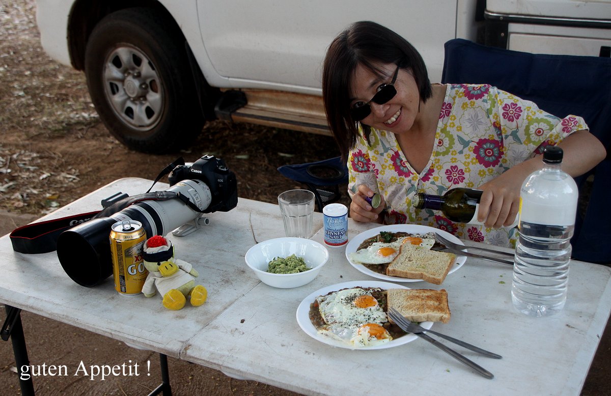 Einmal tauchten auch einige der hübschen Double-barred Finches auf. Unter einem laufenden Rasensprenger zählte ich bei einem kleinen Rundgang 30-40 von dieser Art. Es war inzwischen 41° bei 9% Luftfeuchtigkeit, richtiges Wüstenklima. Bei Recherchen im Internet stellte ich fest, dass in unserem Ort, Fitzroy River Crossing, heute die höchste Temperatur von ganz Westaustralien gemessen wurde. Von den heftigen Buschbränden in der Gegend von Sydney sind wir aber Gott sei Dank nicht betroffen. Ich spritzte mich öfters mit Wasser aus unserem Wasserschlauch ab. Das war sehr erfrischend. Die Wirkung hielt allerdings nicht lange an. Nach 5 min war ich wieder komplett trocken. Gegen 16.30 h begann Tomoko zu kochen, heute wieder mexikanisch, Bohnen mit Avocado-Creme (Guacamole) und jeweils 2 Spiegeleiern. Leider hatten wir vergessen mehr Bier im Kühlschrank zu lagern. Es gab nur ein einziges, von dem ich Tomoko und Entelchen einen Schluck abgab. |