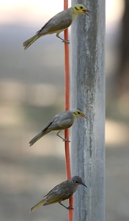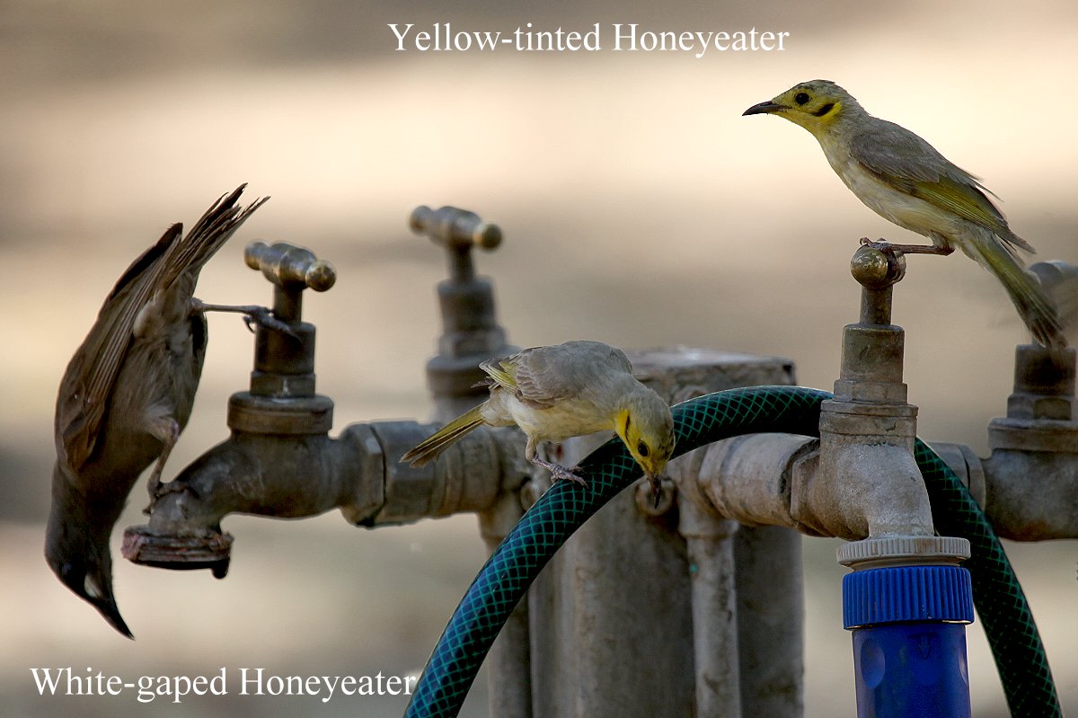 Immer wieder schauten wir nach draußen, wo sich ständig zahlreiche Vögel einfanden, die sich an den tropfenden Wasserhähnen vor unserem Auto begierig ums Wasser stritten. Ein junger Red-winged Parrot wurde von einem männlichen Vogel, wahrscheinlich der Vater, mit Wasser gefüttert. |